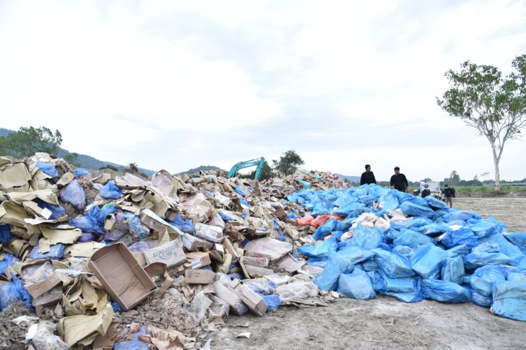 การดำเนินการกับซากสุกรของกลาง แบ่งเป็น 3 ส่วนคือ ทำลายแล้ว 179,612 กิโลกรัม คิดเป็นมูลค่า 71 ล้านบาท ส่วนที่สองอยู่ในระหว่างดําเนินคดี 186,116 กิโลกรัม คิดเป็นมูลค่า 25 ล้านบาท เมื่อคดีสิ้นสุดจะได้ดำเนินการทำลายต่อไป และส่วนที่สามรวบรวมเพื่อทำลายในวันนี้ 723,786 กิโลกรัม คิดเป็นมูลค่า 123 ล้านบาท โดยชิ้นส่วนเครื่องในและเนื้อสุกรของกลาง ส่วนใหญ่มีแหล่งผลิตมาจากต่างประเทศ เช่น ประเทศบราซิล ประเทศเยอรมนี ประเทศอิตาลี เป็นต้น