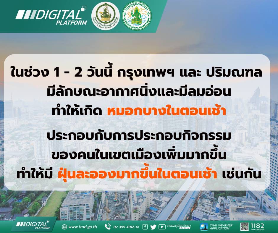 ส่วนกรุงเทพมหานครได้รับอิทธิพลจากลมตะวันออกเฉียงใต้เช่นเดียวกัน โดยมีความเร็วลมประมาณ 10-20 กิโลเมตร/ชั่วโมง โดยเป็นลมที่พัดจากทะเลนำความชื้นเข้าปกคลุมก่อให้เกิดหมอกเหนือพื้นดินได้ในเวลากลางคืนและจางหายไปในเวลาเข้าภายหลังดวงอาทิตย์ขึ้น เกิดจากในตอนกลางคืนพื้นดินจะคายความร้อนหรือแผ่รังสีออกได้มากเป็นเหตุให้พื้นดินเย็นลง อากาศในชั้นล่างที่อยู่ใกล้พื้นดินจะเย็นลงด้วย จนมีอุณหภูมิเท่ากับจุดน้ำค้างทำให้ไอน้ำในอากาศที่อยู่ใกล้พื้นดินกลั่นตัวเกิดเป็นหมอก โดยลักษณะอากาศที่นิ่งและลมอ่อน ประกอบกับในช่วงเช้ากิจกรรมของคนในเขตเมืองเพิ่มมากขึ้น ทำให้เกิดฝุ่นละอองมากขึ้นในตอนเช้าเช่นเดียวกัน จึงเกิดการคลุกเคล้าของหมอกและฝุ่นรวมกันได้ ส่งผลให้ทัศนวิสัยการมองเห็นลดลง