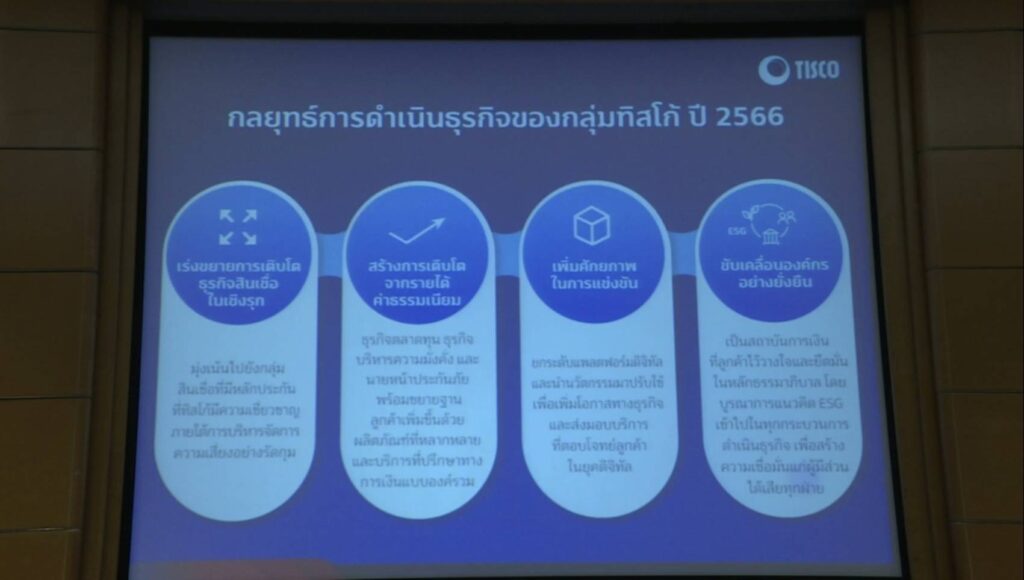 สำหรับแผนดำเนินงานปี2566 กลุ่มทิสโก้ ปรับกลยุทธ์เข้าสู่โหมดของ “การเติบโต” ตามทิศทางเศรษฐกิจที่ฟื้นตัวโดยนำความเชี่ยวชาญในทุกแขนงมาพัฒนาต่อยอด ด้วยกลยุทธ์ที่ครอบคลุมในทุกมิติ ทั้ง 4 ด้าน ได้แก่ เร่งขยายการเติบโตธุรกิจสินเชื่อในเชิงรุก โดยเน้นกลุ่มสินเชื่อที่มีหลักประกันที่กลุ่มทิสโก้มีความเชี่ยวชาญ ในกลุ่มสินเชื่อเช่าซื้อ สินเชื่อจำนำทะเบียน สินเชื่อเพื่อการบริโภค ด้วยการกระจายเครือข่ายสาขาอย่างครอบคลุม, สร้างการเติบโตจากรายได้ค่าธรรมเนียม ในกลุ่มธุรกิจนายหน้าประกันภัย ธุรกิจธนบดีและตลาดทุน, ยกระดับการให้บริการผ่านช่องทางดิจิทัล และพัฒนาแพลตฟอร์มดิจิทัลอย่างต่อเนื่อง มุ่งให้เกิดระบบนิเวศทางธุรกิจ (Ecosystem) ตอบโจทย์ลูกค้าในยุคปัจจุบัน, และขับเคลื่อนองค์กรด้วยความยั่งยืน ตามแนวทาง ESG สร้างความเชื่อมั่นแก่ผู้มีส่วนได้เสียทุกฝ่าย