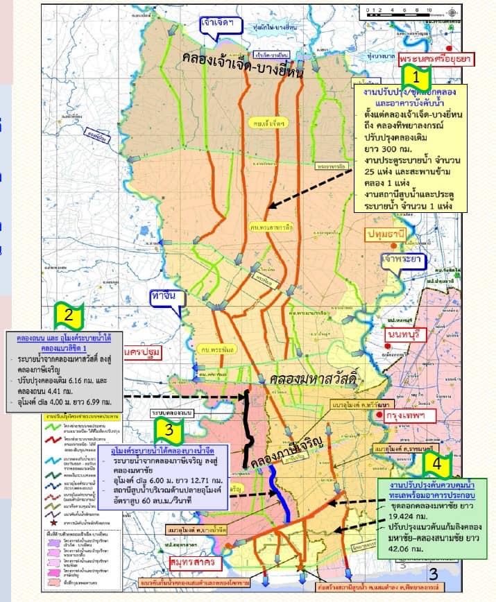 1. งานปรับปรุง/ขุดลอกคลองแนวเหนือ-ใต้และอาคารบังคับน้ำ ช่วงตั้งแต่คลองเจ้าเจ็ด-บางยี่หนถึงคลองพิทยาลงกรณ์ เพื่อเพิ่มประสิทธิภาพการระบายน้ำจากคลองเจ้าเจ็ด-บางยี่หนลงชายทะเลอ่าวไทยระยะทางประมาณ 300 กิโลเมตร