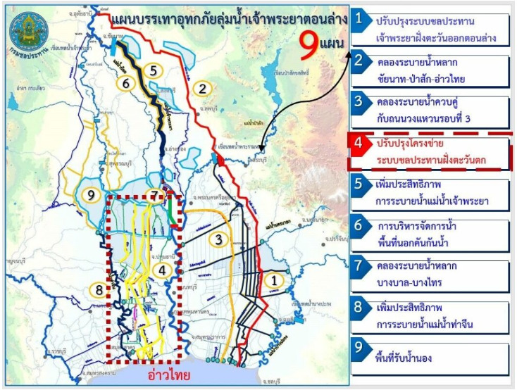 กรมชลประทานจึงได้ดำเนินการศึกษา สำรวจ ออกแบบ โครงการปรับปรุงระบบชลประทานเจ้าพระยาฝั่งตะวันตก เพื่อเพิ่มศักยภาพการระบายน้ำ โดยลดภาระการระบายน้ำลงสู่แม่น้ำท่าจีนและแม่น้ำเจ้าพระยา โดยมีแผนการดำเนินโครงการ 4 ปี ตั้งแต่ พ.ศ. 2568 – พ.ศ. 2571 และมีองค์ประกอบโครงการ ดังนี้
