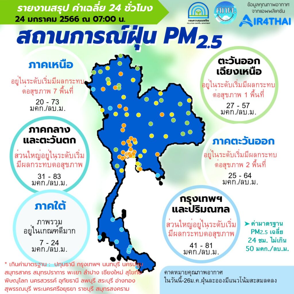 ศูนย์แก้ไขปัญหามลพิษทางอากาศ (ศกพ.) รายงานการติดตามตรวจสอบคุณภาพอากาศประจำวันที่ 24 มกราคม 2566 ณ 07:00 น พบปริมาณ PM2.5 ในประเทศค่ามาตรฐานใน 23 จังหวัดได้แก่ จ.ปทุมธานี กรุงเทพฯ จ.นนทบุรี จ.นครปฐม จ.สมุทรสาคร จ.สมุทรปราการ จ.พะเยา จ.ลำปาง จ.เชียงใหม่ จ.สุโขทัย จ.พิษณุโลก จ.นครสวรรค์ จ.อุทัยธานี จ.ลพบุรี จ.สระบุรี จ.อ่างทอง จ.สุพรรณบุรี จ.พระนครศรีอยุธยา จ.ราชบุรี จ.สมุทรสงคราม จ.สระแก้ว จ.ระยอง และจ. ขอนแก่น
