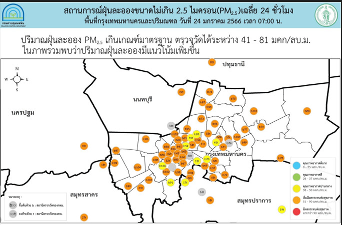 กรุงเทพฯ 24 ม.ค. – กรมควบคุมมลพิษพบฝุ่น PM2.5 เกินค่ามาตรฐานถึง 23 จังหวัด ส่วนกทม.- ปริมณฑลเกินค่ามาตรฐานเป็นส่วนใหญ่ ย้ำเฝ้าระวังต่อเนื่องถึงปลายเดือนม.ค. เนื่องจากสภาพอากาศที่นิ่งและปิด ประกอบกับมีมวลอากาศเย็นระลอกใหม่จากประเทศจีนแผ่เข้ามา