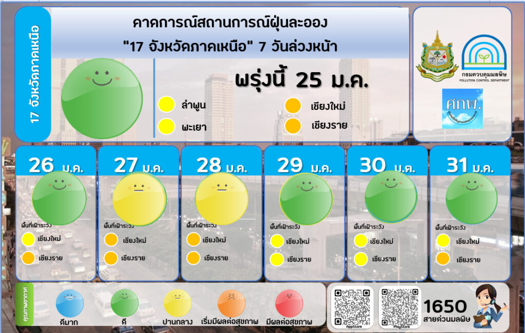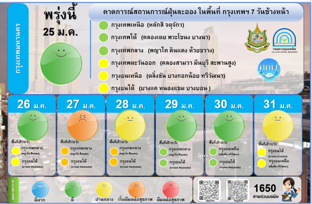 ทั้งนี้กองจัดการคุณภาพอากาศและเสียง กรมควบคุมมลพิษย้ำว่า ระหว่างวันที่ 27-28 มกราคม พื้นที่กรุงเทพฯ และปริมณฑลควรเฝ้าระวังการสะสมของฝุ่นละออง เนื่องจากสภาพอากาศที่นิ่งและปิด ประกอบกับมีมวลอากาศเย็นระลอกใหม่จากประเทศจีนแผ่เข้ามา โดยพื้นที่ที่ควรเฝ้าระวัง ได้แก่พื้นที่กรุงเทพกลาง กรุงธนเหนือและใต้ เช่นเดียวกับพื้นที่ 17 จังหวัดภาคเหนือควรเฝ้าระวังบริเวณภาคเหนือตอนบนและล่างในห้วงเวลาเดียวกัน