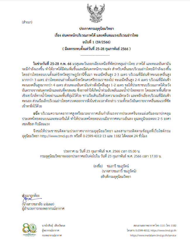 นายประพิศ จันทร์มา อธิบดีกรมชลประทานเปิดเผยว่า สั่งการให้โครงการชลประทานทุกแห่งในภาคใต้เฝ้าระวังฝนตกหนัก ตามที่กรมอุตุนิยมวิทยาแจ้งเตือนว่า มรสุมตะวันออกเฉียงเหนือหรือมวลอากาศเย็นกำลังค่อนข้างแรงอีกระลอกแผ่ลงมาปกคลุมประเทศไทยตอนบน จะทำให้ระหว่างวันที่ 24 -28 กุมภาพันธ์ มีฝนตกเพิ่มขึ้นและคลื่นลมแรงขึ้น โดยเฉพาะภาคใต้ตอนล่างบริเวณจังหวัดสงขลา พัทลุง ปัตตานี ยะลา และนราธิวาส จากนั้นช่วงวันที่ 28 กุมภาพันธ์ – 3 มีนาคมเนื่องจากมีหย่อมความกดอากาศต่ำทางด้านตะวันออกของประเทศมาเลเซียและลมตะวันออกกำลังแรงพัดปกคลุมจึงต้องเฝ้าระวังฝนตกหนักและติดตามอย่างใกล้ชิด
