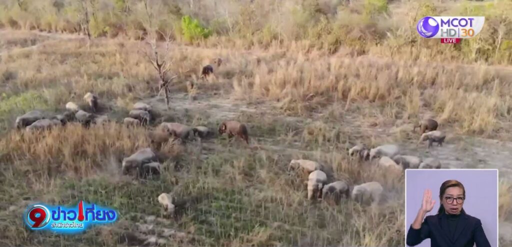 เลย 1 มี.ค. – ภาพมุมสูง โขลงช้างป่าไม่ต่ำกว่า 40 ตัว เข้ามากินพืชผลทางการเกษตรในเขต อ.ภูกระดึง จ.เลย เสียหายกว่า 2,000 ไร่ เจ้าหน้าที่เร่งทำความเข้าใจกับชาวบ้าน ขอความร่วมมือเร่งเก็บเกี่ยวอ้อย เพื่อป้องกันความเสียหาย