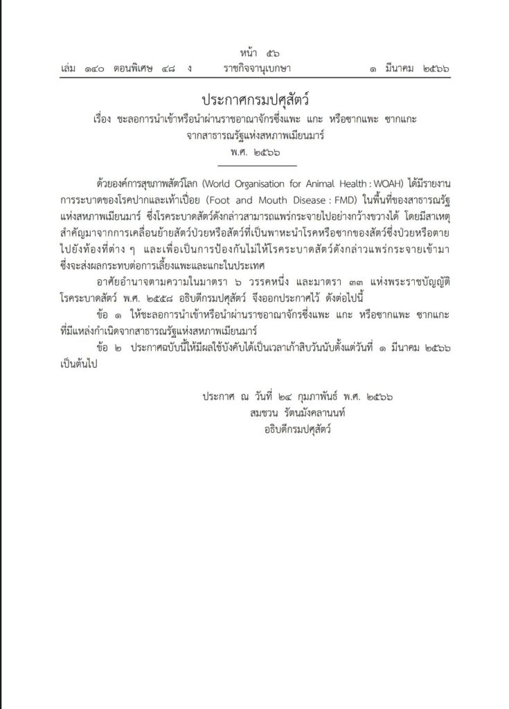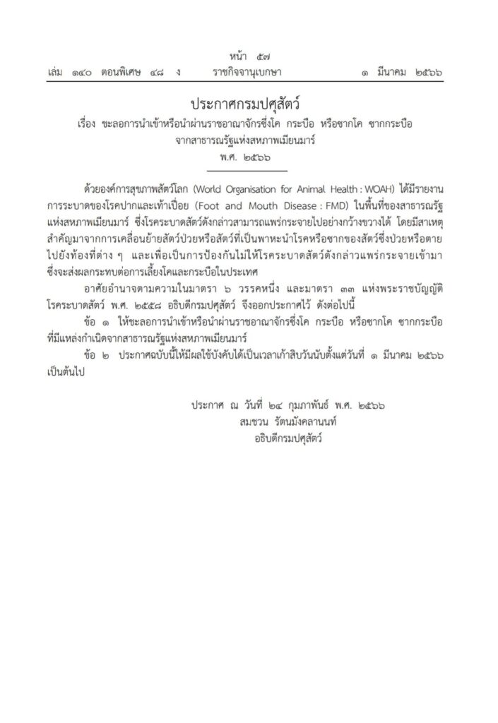 นายสัตวแพทย์สมชวน รัตนมังคลานนท์ อธิบดีกรมปศุสัตว์กล่าวว่า ได้ออกประกาศ 2 ฉบับ ประกอบด้วย เรื่อง ชะลอการนำเข้าหรือนำผ่านราชอาณาจักรซึ่งโค กระบือ หรือซากโค ซากกระบือ และเรื่อง ชะลอการนำเข้าหรือนำผ่านราชอาณาจักรสัตว์ซึ่งแพะ แกะ หรือซากแพะ ซากแกะจากสาธารณรัฐแห่งสหภาพเมียนมาร์ ตามที่องค์การสุขภาพสัตว์โลก (World Organisation for Animal Health : WOAH) รายงานการระบาดของโรคปากและเท้าเปื่อย (Foot and Mouth Disease : FMD) ในพื้นที่ของสาธารณรัฐแห่งสหภาพเมียนมาร์ ดังนั้นจึงอาศัยอำนาจอธิบดีกรมปศุสัตว์ตามความในมาตรา 6 วรรคหนึ่ง และมาตรา 33 แห่งพระราชบัญญัติโรคระบาดสัตว์ พ.ศ. 2558 ออกประกาศดังกล่าวเพื่อป้องกันไม่ให้โรคระบาดสัตว์ดังกล่าวแพร่กระจายเข้ามาในประเทศ เนื่องจากโรคปากและเท้าเปื่อยสามารถแพร่กระจายไปอย่างกว้างขวางได้ โดยมีสาเหตุสำคัญมาจากการเคลื่อนย้ายสัตว์ป่วยหรือสัตว์ที่เป็นพาหะนำโรคหรือซากของสัตว์ซึ่งป่วยหรือตายไปยังท้องที่ต่างๆ หากแพร่กระจายเข้ามาจะส่งผลกระทบต่อการเลี้ยงโค กระบือ แพะ และแกะในประเทศไทย