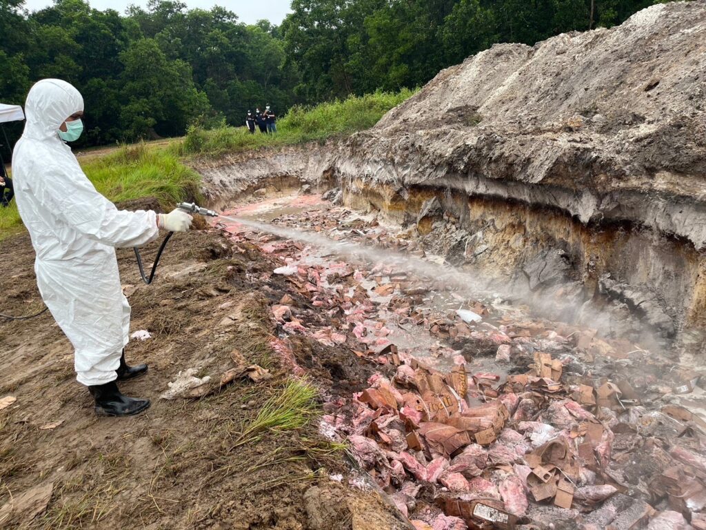 ล่าสุด เมื่อวันที่ 1 มีนาคม 2566 ภายหลังจากได้รับมอบของกลาง ด่านกักกันสัตว์สงขลา ร่วมกับเจ้าหน้าที่จากปศุสัตว์เขต 9 ปศุสัตว์จังหวัดสงขลา และศูนย์วิจัยและบำรุงพันธุ์สัตว์เทพา ได้ทำการฝังทำลายซากสุกรแช่แข็งเป็นที่เรียบร้อยแล้ว ตามพรบ.โรคระบาดสัตว์ พ.ศ. 2558 และบันทึกข้อตกลงระหว่างกรมปศุสัตว์กับกรมศุลกากร เรื่อง การปฏิบัติเกี่ยวกับกรณีที่มีการจับกุมดำเนินคดีลักลอบนำสัตว์หรือซากสัตว์เข้ามาในราชอาณาจักร โดยได้นำซากสุกรไปทำลายตามระเบียบของกรมปศุสัตว์ด้วยการฝังกลบในระดับความลึกไม่ต่ำกว่า 50 เซนติเมตร แล้วพ่นยาฆ่าเชื้อ และฝังกลบทับอีกชั้นในระดับไม่ต่ำกว่า 50 เซนติเมตร เพื่อความปลอดภัย และป้องกันโรคระบาดที่อาจจะปะปนในสัตว์หรือซากสัตว์ที่นำเข้าโดยผิดกฎหมาย