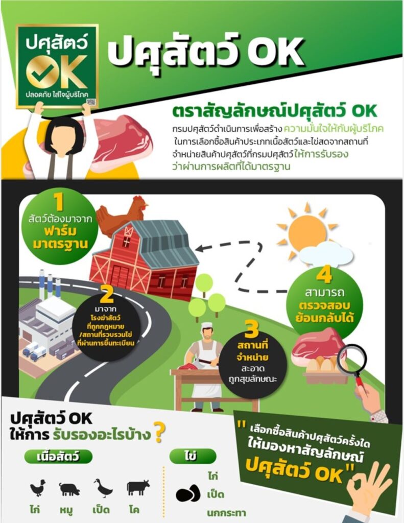 พร้อมกันนี้ขอให้ประชาชนเลือกซื้อสินค้าปศุสัตว์จากสถานที่จำหน่ายที่ได้รับมาตรฐาน “ปศุสัตว์ OK” จากกรมปศุสัตว์ ที่เป็นการรับรองสถานที่จำหน่ายเนื้อสัตว์ โดยเนื้อสัตว์ที่นำมาขาย ต้องมาจากฟาร์มมาตรฐาน เชือดที่โรงฆ่าสัตว์ที่ถูกกฎหมาย ขายในสถานที่จำหน่ายที่สะอาดถูกสุขลักษณะ รวมทั้งต้องสามารถตรวจสอบย้อนกลับถึงแหล่งที่มาของเนื้อสัตว์ที่นำมาขายได้