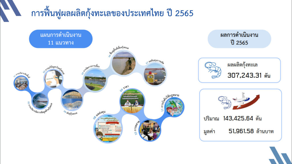 ทั้งนี้นายเฉลิมชัย ศรีอ่อน รัฐมนตรีว่าการกระทรวงเกษตรและสหกรณ์มอบหมายให้กรมประมงเร่งฟื้นฟูอุตสาหกรรมการเพาะเลี้ยงกุ้งทะเลให้มีผลผลิต 400,000 ตัน ภายในปี 2566 เพื่อให้ประเทศไทยกลับมาเป็นผู้นำการผลิตในตลาดโลกได้อีกครั้ง