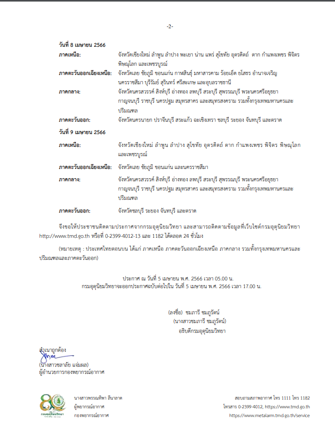 นางสาวชมภารี ชมภูรัตน์ อธิบดีกรมอุตุนิยมวิทยากล่าวว่า วันพรุ่งนี้ (6 เม.ย.) ประเทศไทยตอนบนจะมีอากาศร้อนและร้อนจัดบางพื้นที่เนื่องจากลมตะวันตกและตะวันตกเฉียงเหนือยังพัดปกคลุม ประกอบกับหย่อมความกดอากาศต่ำเนื่องจากความร้อนที่ปกคลุมอยู่ นอกจากนี้ยังได้รับปัจจัยจากลมระดับล่างที่ยังมีลมใต้และตะวันออกเฉียงใต้กำลังอ่อนถึงปานกลางพัดนำความชื้นปกคลุมภาคตะวันออกเฉียงเหนือตอนล่าง ภาคกลาง กทม. – ปริมณฑล และภาคตะวันออก สภาวะดังกล่าวส่งผลให้ “ดัชนีความร้อน” เพิ่มสูงขึ้น