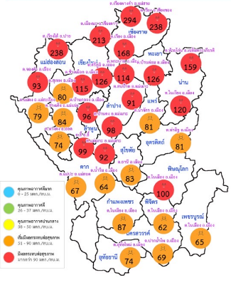 ผลการตรวจวัดดังกล่าวบ่งชี้ สถานการณ์ฝุ่น PM2.5 พื้นที่ 17 จังหวัดภาคเหนือยังน่าเป็นห่วงหลายพื้นที่ โดยเฉพาะพื้นที่สีแดงซึ่งอยู่ในระดับมีผลกระทบต่อสุขภาพ ปริมาณฝุ่นเกินกว่า 200 มคก./ลบ.ม. ประกอบด้วย อ. แม่สาย จ. เชียงราน 294 มคก./ลบ.ม. อ. เชียงของ จ. เชียงราย 238 มคก./ลบ.ม. อ. ปาย จ. แม่ฮ่องสอน 238 มคก./ลบ.ม. และอ. เชียงดาว จ. เชียงใหม่ 213 มคก./ลบ.ม.