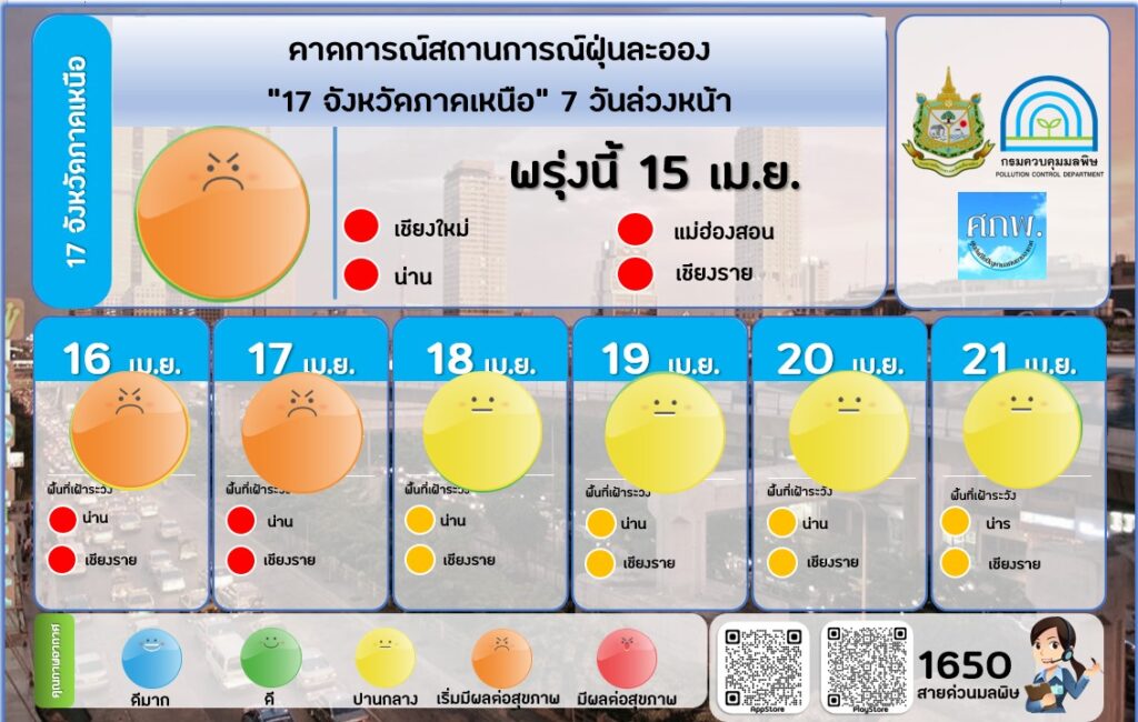 กองจัดการคุณภาพอากาศและเสียง กรมควบคุมมลพิษคาดการณ์ว่า ยังต้องเฝ้าระวังในพื้นที่ภาคเหนือตอนบนโดยเฉพาะพื้นที่จังหวัดที่ติดกับประเทศเพื่อนบ้านจนถึงวันที่ 17 เม.ย. จังหวัดที่ควรเน้นการเฝ้าระวังได้แก่ จังหวัดเชียงรายและน่าน จากนั้นสถานการณ์จะเริ่มดีขึ้นเนื่องจากความเร็วลมที่ระดับชั้นบน มีกำลังแรงขึ้น ส่งผลให้การระบายฝุ่นของพื้นที่ดีขึ้น