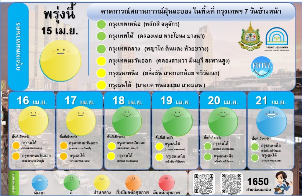 ส่วนในพื้นที่กรุงเทพมหานครและปริมณฑลยังคงมีแนวโน้มที่ดีถึงปานกลาง เนื่องจากสภาพอากาศที่เปิดมากขึ้น เพดานการลอยตัวอากาศที่สูงขึ้น ประกอบกับลมทางใต้ที่กำลังแรงช่วยพัดพาฝุ่นละอองออกจากพื้นที่ อย่างไรก็ตามวันที่ 15-17 เม.ย. อาจมีสภาพอากาศที่ปิดได้ในบางพื้นที่ รจึงควรเพิ่มการเฝ้าระวัง