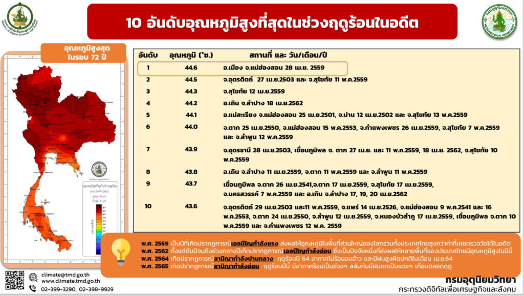 ว่าที่ ร.ต. ธนะสิทธิ์ เอี่ยมอนันชัย รองอธิบดีกรมอุตุนิยมวิทยากล่าวว่า ครึ่งหลังของเดือนเมษายนซึ่งเป็นปลายฤดูร้อน อุณหภูมิจะไม่สูงมากเหมือนครึ่งแรกของเดือน ทั้งนี้ช่วงอากาศร้อนที่สุดผ่านพ้นไปแล้ว โดยอุณหภูมิสูงสุดคือ 44.6 องศาเซลเซียสที่อำเภอเมือง จังหวัดตากเมื่อวันที่ 15 เมษายนซึ่งเท่ากับอุณหภูมิสูงสุดที่เก็บสถิติได้เมื่อวันที่ 28 เมษายน 2559 ที่อำเภอเมือง จังหวัดแม่ฮ่องสอน หลังจากนี้ลมจะค่อยๆ เริ่มเปลี่ยนทิศจากลมใต้ที่พัดพาหย่อมความกดอากาศต่ำจากความร้อนเป็นลมตะวันตกเฉียงใต้เมื่อเข้าสู่ฤดูฝน