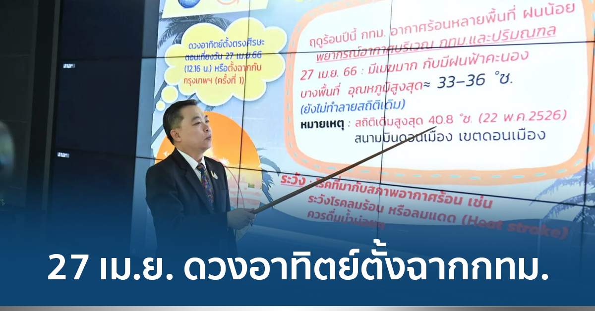 ในวันที่ 27 เมษายน เวลา 12.16 น. ดวงอาทิตย์จะตั้งฉากกลางประเทศไทยบริเวณกรุงเทพมหานคร แต่อากาศไม่ร้อนจัดเนื่องจากวันที่ 24-26 จะมีพายุฤดูร้อนเพราะมวลอากาศเย็นระลอกใหม่แผ่ลงมาปะทะกับอากาศร้อน จึงคาดว่า วันที่ 27 จะมีเมฆมากกับฝนฟ้าคะนองบางพื้นที่ อุณหภูมิสูงสุด 33-36 องศาเซลเซียส ต่ำกว่าสถิติวันที่ 22 พฤษภาคม 2526 – 40.8 องศาเซลเซียสที่เขตดอนเมือง