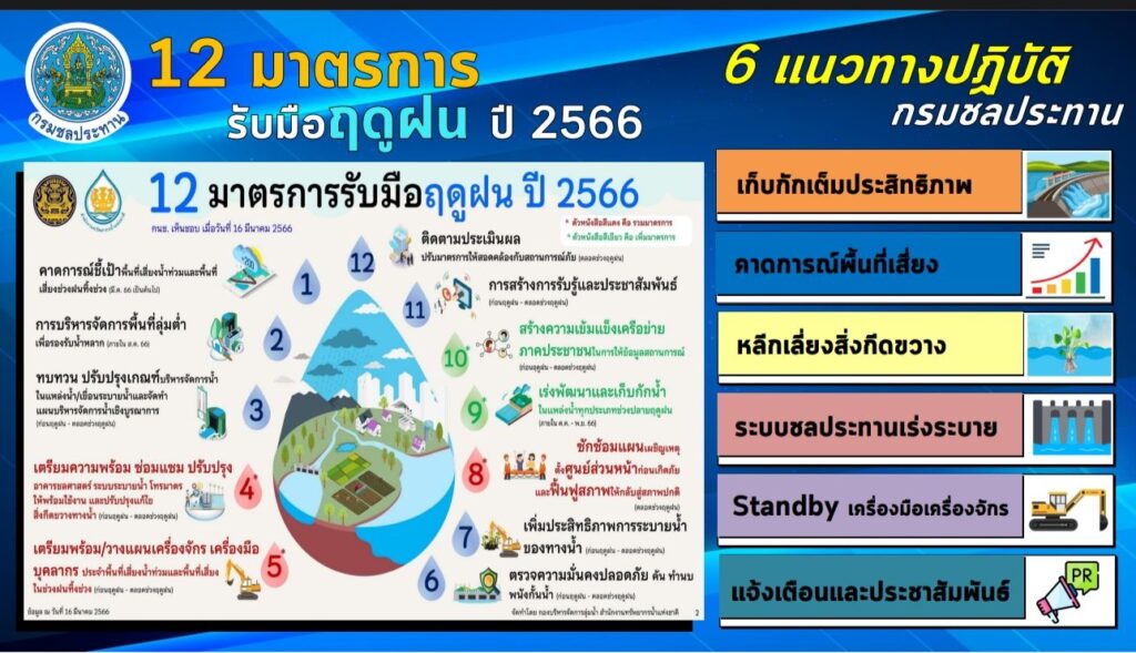 อธิบดีกรมชลประทานกล่าวว่า กรมชลประทานจะบริหารจัดการน้ำให้สอดคล้องกับสภาพอากาศและสถานการณ์ฝน โดยได้เน้นย้ำให้โครงการชลประทานทั่วประเทศปฏิบัติตาม 12 มาตรการฤดูฝนปี 2566 ของกองอำนวยการน้ำแห่งชาติ (กอนช.) ขณะนี้ได้คาดการณ์พื้นที่เสี่ยงซึ่งอาจมีปริมาณและการกระจายของฝนน้อย อาจทำให้เกิดการขาดแคลนน้ำในด้านการเกษตร ไว้แล้ว เพื่อช่วยลดผลกระทบ ขณะเดียวกันคาดการณ์พื้นที่เสี่ยงที่อาจเกิดน้ำท่วมฉับพลันและน้ำไหลหลากในห้วงที่พายุหมุนเขตร้อนเคลื่อนตัวเข้าสู่ประเทศไทย จึงเป็นการบริหารจัดการน้ำที่เตรียมรับมือทั้งฝนทิ้งช่วงและอุทกภัยควบคู่กันไป