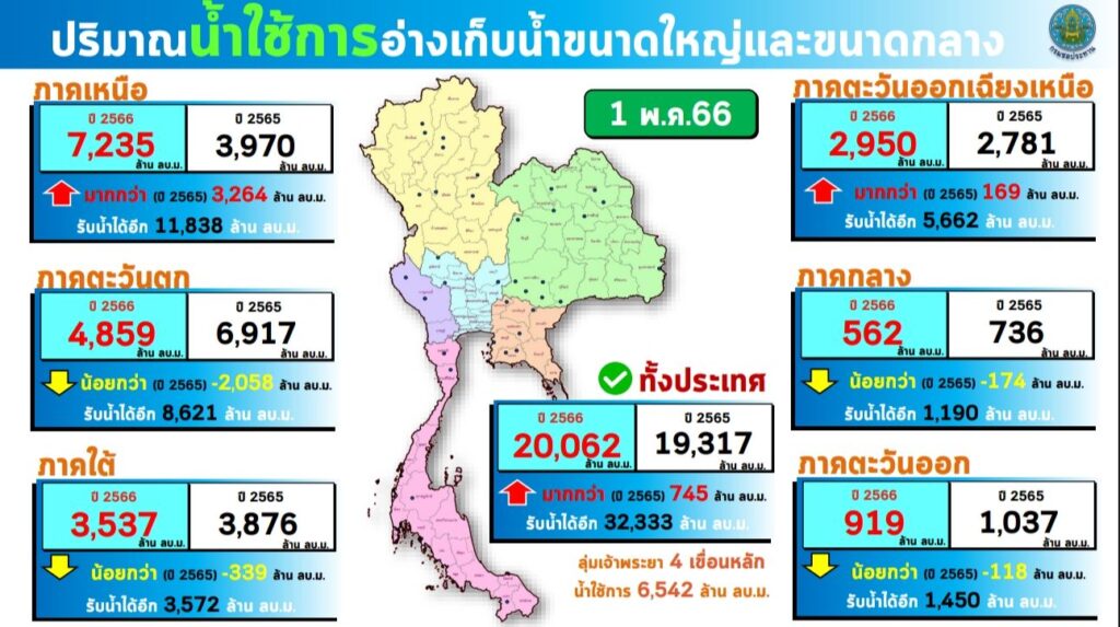 อธิบดีกรมชลประทานกล่าวถึงต้นแบบการบริหารจัดการน้ำในภาวะฝนน้อยจากฤดูแล้งปี 2565/66 (ตั้งแต่วันที่ 1 พฤศจิกายน 2565 – 30 เมษายน 2566) จากปริมาณน้ำต้นทุนที่จะจัดสรรได้ทั่วประเทศ 27,685 ล้านลูกบาศก์เมตร (ลบ.ม.) เฉพาะลุ่มน้ำเจ้าพระยาวางแผนจัดสรรน้ำไว้ประมาณ 9,100 ล้าน ลบ.ม. เพื่อสนับสนุนการใช้น้ำเพื่ออุปโภคบริโภค รักษาระบบนิเวศ การเกษตร อุตสาหกรรม รวมไปถึงการควบคุมค่าความเค็มและคุณภาพน้ำในแม่น้ำสายหลักต่างๆ ภายใต้มาตรการฤดูแล้งปี 2565/66 ของกอนช. ปัจจุบันได้สิ้นสุดฤดูแล้งแล้ว พบว่า การจัดสรรน้ำเป็นไปตามแผนที่วางไว้ โดยทั้งประเทศมีการใช้น้ำไปทั้งสิ้นประมาณ 25,200 ล้าน ลบ.ม. เฉพาะลุ่มน้ำเจ้าพระยา มีการใช้น้ำไปทั้งสิ้นประมาณ 9,120 ล้าน ลบ.ม. ส่งผลให้ในเขตพื้นที่ชลประทานมีน้ำใช้อย่างเพียงพอและไม่เกิดปัญหาขาดแคลนน้ำ อีกทั้งยังทำให้มีปริมาณน้ำสำรองไว้ใช้ในช่วงต้นฤดูฝนมากกว่าแผนที่วางไว้
