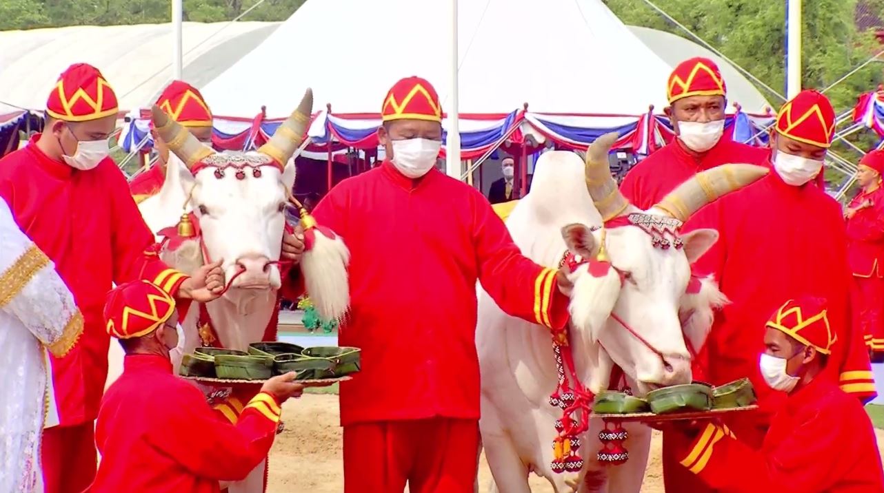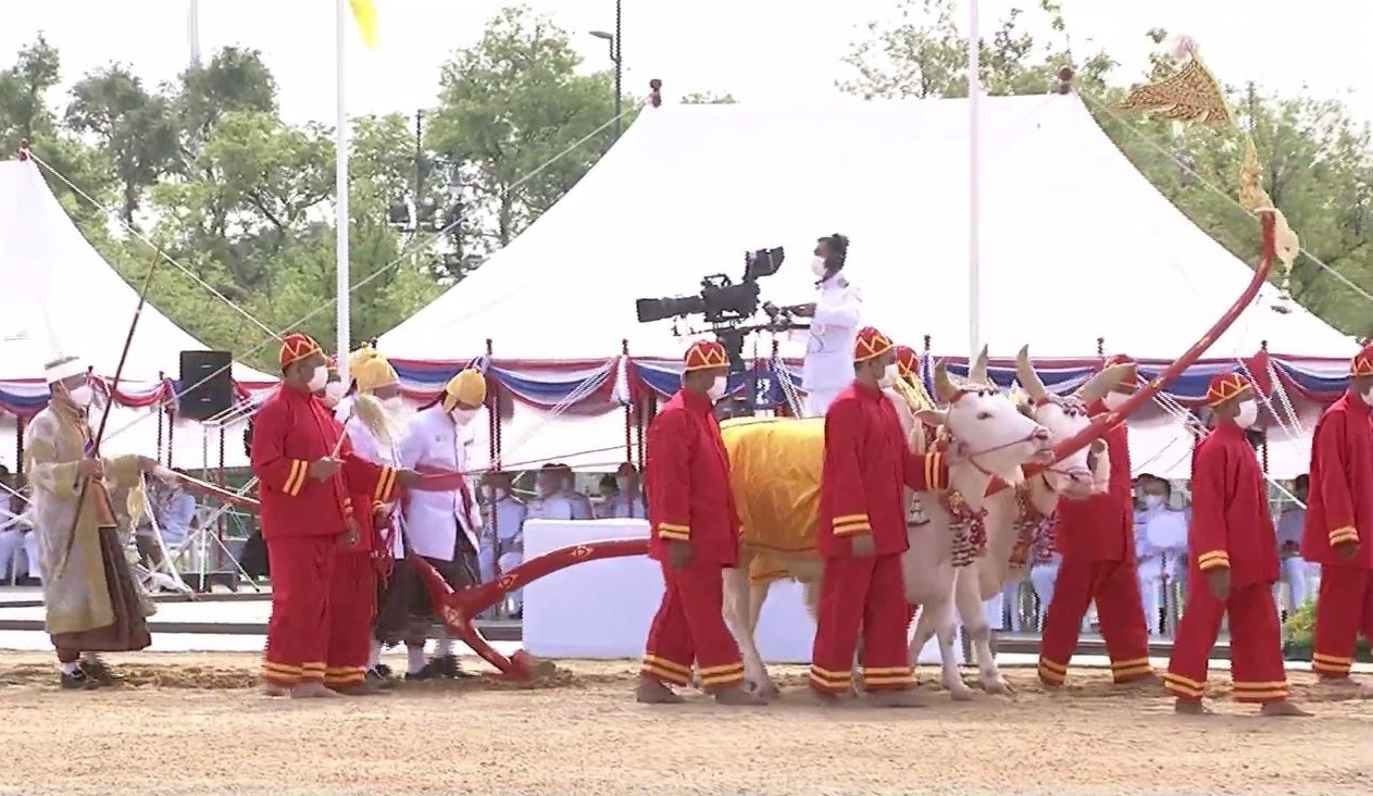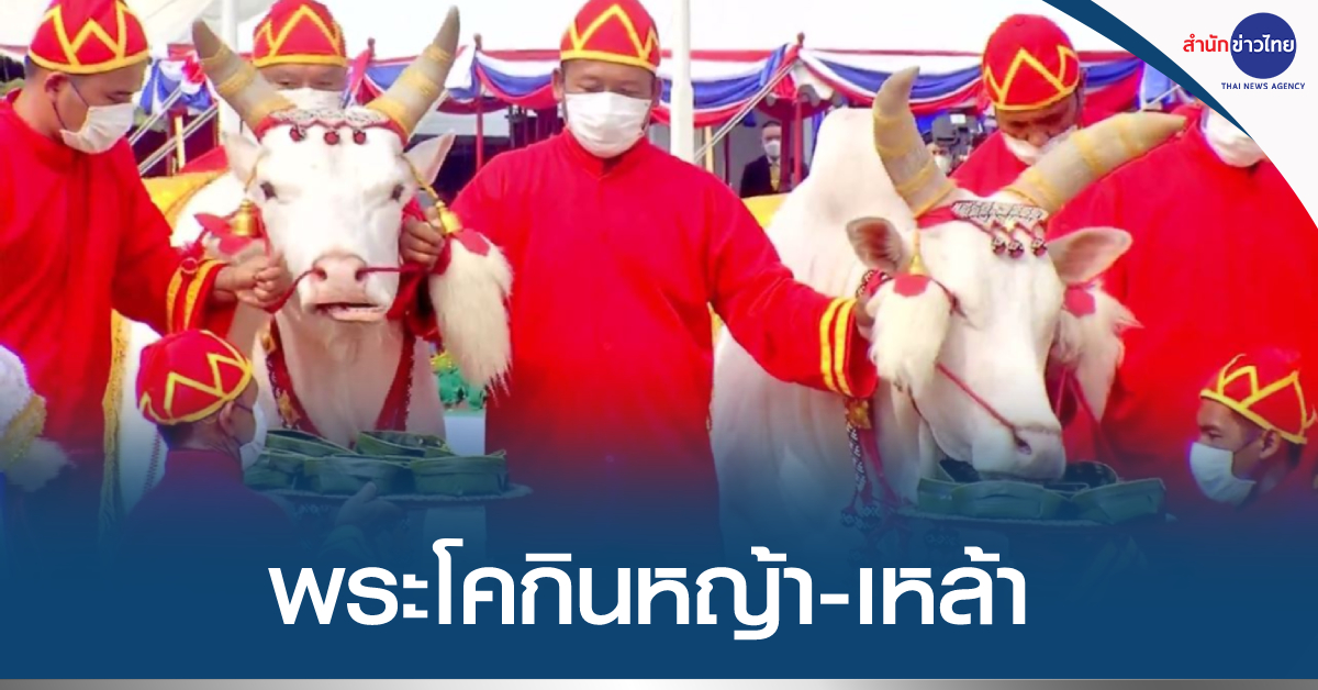 ผลการเสี่ยงทายของกิน 7 สิ่ง ที่ตั้งเลี้ยงพระโค พระโคกินหญ้าและเหล้า ซึ่งผลเสี่ยงทายกล่าวว่า ถ้าพระโคกินหญ้า พยากรณ์ว่า น้ำท่าจะบริบูรณ์พอสมควร ธัญญาหาร ผลาหาร ภักษาหาร มังสาหาร จะอุดมสมบูรณ์ดี และพระโคกินเหล้า พยากรณ์ว่า การคมนาคมสะดวกขึ้น การค้าขายกับต่างประเทศดีขึ้น ทำให้เศรษฐกิจรุ่งเรือง. – สำนักข่าวไทย