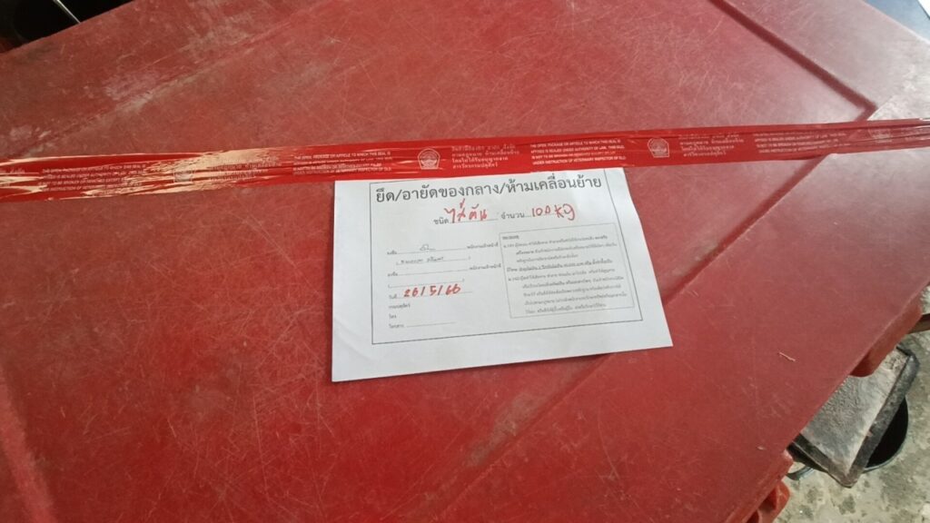 พนักงานเจ้าหน้าที่จึงยึดและอายัดสินค้ากว่า 1,200 กิโลกรัม จากนั้นจึงนำหลักฐานทั้งหมดส่งพนักงานสอบสวนสภ. พานทอง โดยให้ผู้ประกอบการนำเอกสารที่เกี่ยวข้องมาแสดงต่อพนักงานเจ้าหน้าที่ภายใน 15 วัน หากไม่สามารถนำเอกสารมาแสดงได้จะถูกดำเนินคดีตามกฎหมาย