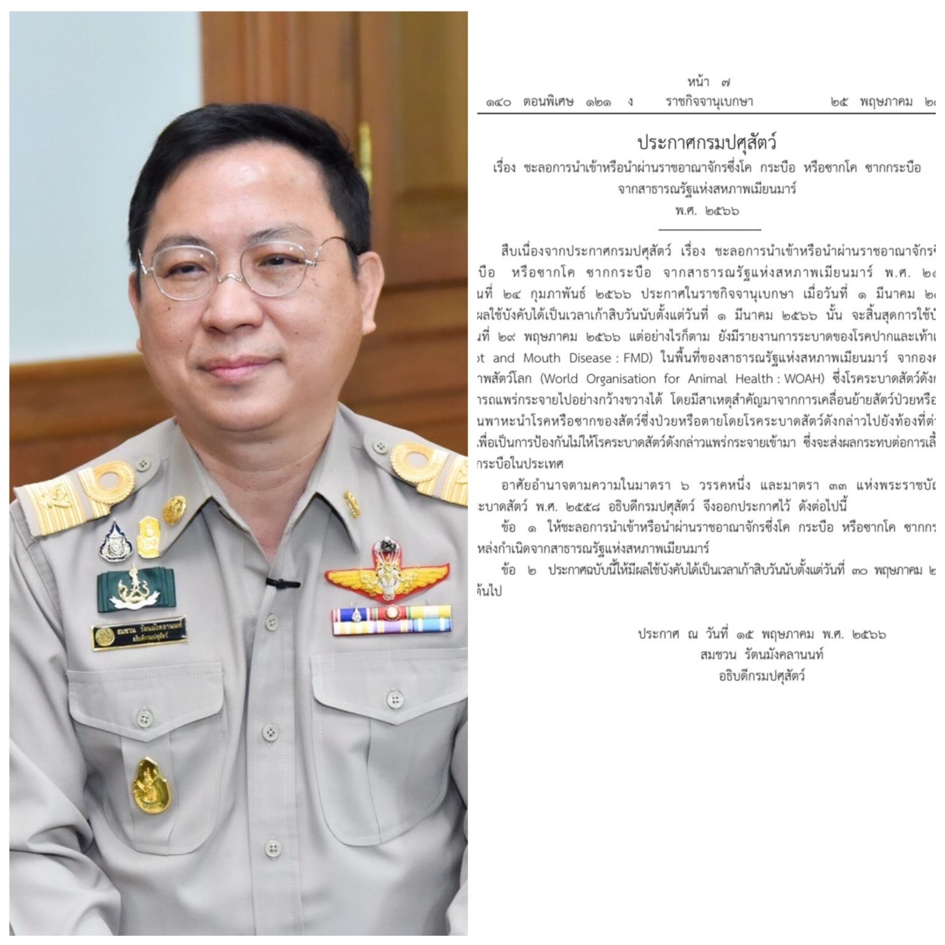 นายสัตวแพทย์สมชวน รัตนมังคลานนท์ อธิบดีกรมปศุสัตว์ กล่าวว่า ราชกิจจานุเบกษาได้เผยแพร่ประกาศกรมปศุสัตว์ เรื่อง ชะลอการนำเข้าหรือนำผ่านราชอาณาจักรซึ่งโค กระบือ หรือซากโค ซากกระบือ จากสาธารณรัฐแห่งสหภาพเมียนมา ตามที่กรมปศุสัตว์ออกประกาศชะลอการนำเข้าหรือนำผ่านราชอาณาจักร โค กระบือ แพะ แกะ หรือซากโค ซากกระบือ ซากแพะ ซากแกะ จากสาธารณรัฐแห่งสหภาพเมียนมา มีผลบังคับใช้ตั้งแต่วันที่ 1 มีนาคม 2566 และจะสิ้นสุดการบังคับใช้ในวันที่ 29 พฤษภาคม 2566 แต่ปัจจุบันยังมีรายงานการระบาดของโรคปากและเท้าเปื่อย (Foot and Mouth Disease : FMD) ในพื้นที่ของสาธารณรัฐแห่งสหภาพเมียนมา จากองค์การสุขภาพสัตว์โลก (World Organisation for Animal Heath : WOAH) ซึ่งโรคระบาดสัตว์ดังกล่าวสามารถแพร่กระจายไปอย่างกว้างขวางได้