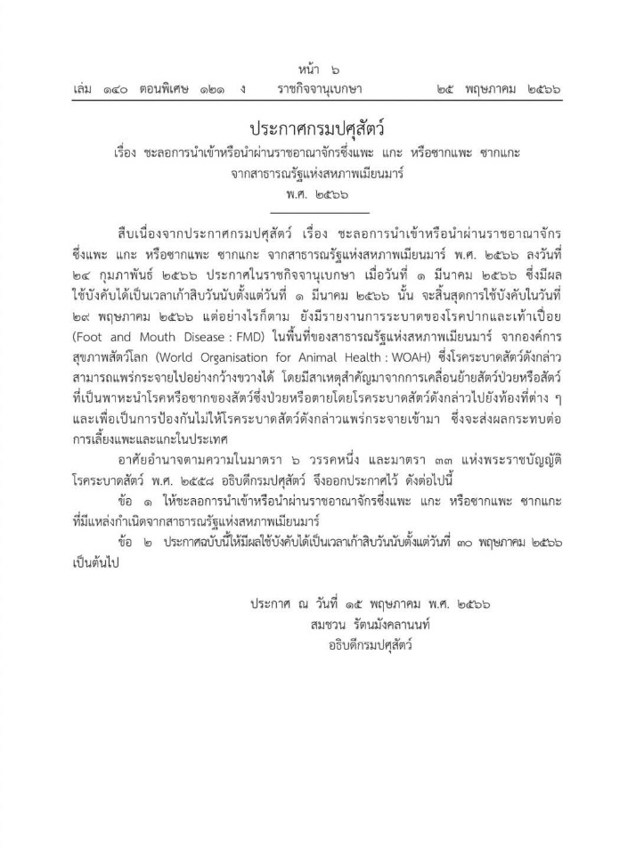 อธิบดีกรมปศุสัตว์กล่าวเพิ่มเติมว่า ได้ออกประกาศเพื่อขยายเวลาการชะลอการนำเข้าหรือนำผ่านราชอาณาจักรซึ่งโค กระบือ หรือซากโค ซากกระบือ จากสาธารณรัฐแห่งสหภาพเมียนมา เนื่องจากประกาศที่มีผลบังคับใช้ตั้งแต่วันที่ 1 มีนาคม 2566 ได้สิ้นสุดการบังคับใช้ในวันที่ 29 พฤษภาคม 2566 แต่ปัจจุบันยังมีรายงานการระบาดของโรคปากและเท้าเปื่อยในเมียนมาอยู่ จึงอาศัยอำนาจตามความในมาตรา 6 วรรคหนึ่ง และมาตรา 33 แห่ง พ.ร.บ. โรคระบาดสัตว์ พ.ศ. 2558 ออกประกาศไว้เพื่อขยายเวลาการชะลอการนำเข้าหรือนำผ่านราชอาณาจักรซึ่งโค กระบือ หรือซากโค ซากกระบือที่มีแหล่งกำเนิดจากสาธารณรัฐแห่งสหภาพเมียนมาไปอีก 90 วัน นับตั้งแต่วันที่ 30 พฤษภาคม 2566 เป็นต้นไป