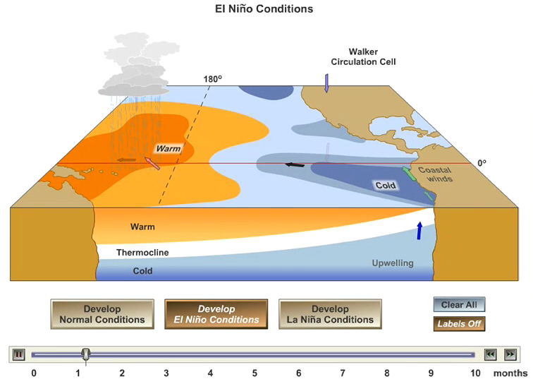 ปัจจุบันประเทศไทยเข้าสู่สภาวะเอลนีโญกำลังอ่อน โดยคาดว่า จะพัฒนาเป็นเอลนีโญกำลังแรง ในช่วงเดือนพฤศจิกายน 2566 ถึงมกราคม 2567 (ค่าดัชนี Niño-3.4 ≥ 1.5°C) และจะต่อเนื่องไปจนถึงเดือนมีนาคม 2567 จากนั้นมีแนวโน้มอ่อนกำลังลง แต่คาดว่า ในช่วงกลางปี 2567 ยังคงมีสถานการณ์เอลนีโญอยู่
