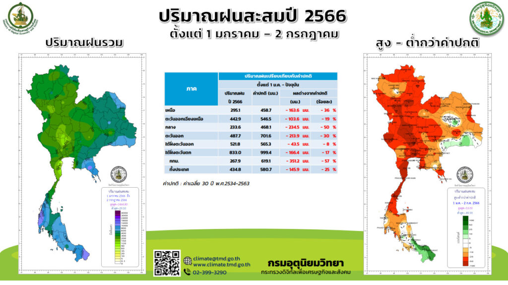 ผลตรวจวัดปริมาณฝนตั้งแต่วันที่ 1 มกราคมถึง 2 กรกฎาคม 2566 พบว่า ปริมาณฝนทั่วประเทศต่ำกว่าค่าปกติ 25% แต่หากพิจารณาตามรายภาคพบว่า กทม. และปริมณฑลต่ำกว่าค่าปกติ 57% ขณะที่ภาคกลางน่าเป็นห่วง ปริมาณฝนต่ำกว่าค่าปกติถึง 50% รองลงมาคือ ภาคเหนือซึ่งต่ำกว่าค่าปกติ 36% ภาคตะวันออกต่ำกว่าค่าปกติ 30% ภาคตะวันออกเฉียงเหนือต่ำกว่าค่าปกติ 19% ภาคใต้ฝั่งตะวันตกต่ำกว่าค่าปกติ 17% และภาคใต้ฝั่งตะวันออกต่ำกว่าค่าปกติ 8%