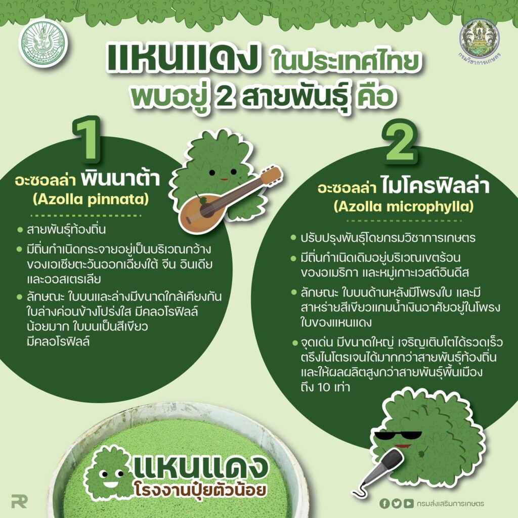 นายระพีภัทร์ จันทรศรีวงศ์ อธิบดีกรมวิชาการเกษตรกล่าวว่า งานวิจัยเกี่ยวกับแหนแดงเป็นความสำเร็จของกรมวิชาการเกษตร โดยพัฒนาสายพันธุ์แหนแดงซึ่งเป็นเฟิร์นลอยน้ำชนิดหนึ่งที่มีขนาดเล็ก เปรียบเสมือนโรงงานผลิตปุ๋ยไนโตรเจนทางชีวภาพ เนื่องจากมีกระบวนการตรึงไนโตรเจนของสาหร่ายสีเขียวแกมน้ำเงินที่อาศัยอยู่ในโพรงใบของแหนแดง ทำให้แหนแดงมีประโยชน์ในด้านทดแทนหรือลดการใช้ปุ๋ยเคมีไนโตรเจน โดยแหนแดงสายพันธุ์ที่พัฒนาขึ้นคือ สายพันธุ์อะซอลล่า ไมโครฟิลล่า (Azolla microphylla) ขึ้นมีลักษณะเด่นคือ มีขนาดใหญ่ ขยายพันธุ์ได้รวดเร็ว