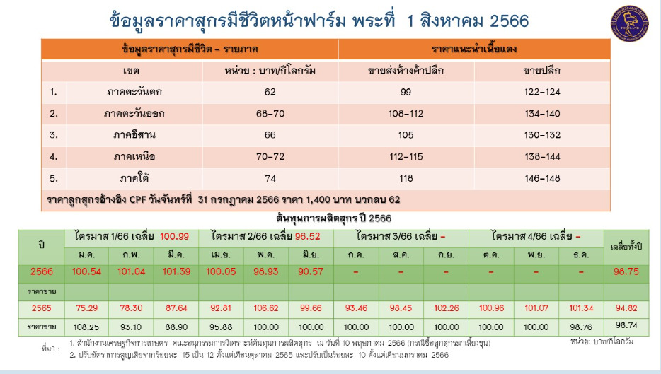 สมาคมผู้เลี้ยงสุกรแห่งชาติประกาศราคาสุกรมีชีวิตหน้าฟาร์มสัปดาห์แรกของเดือนสิงหาคม โดยราคาอยู่ระหว่าง 62- 74 บาทต่อกิโลกรัมตามแต่ละภูมิภาค โดยตลาดมีทิศทางดีขึ้น การซื้อขายจริงมีฐานราคาปรับขึ้นเล็กน้อยในหลายภูมิภาค แม้รายงานแต่ละภูมิภาคยังรายงานราคาที่ทรงตัว พร้อมระบุถึงคดี “หมูเถื่อน” ว่า มีสายของผู้ประกอบการขนส่งทางเรือให้ข้อมูลที่เป็นประโยชน์ต่อการสาวถึงขบวนการลักลอบนำเข้าสินค้าสุกร