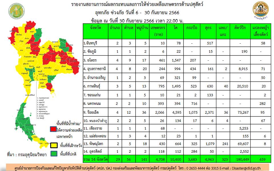 กรุงเทพฯ 1 ต.ค.– อธิบดีกรมปศุสัตว์เผย ส่งความช่วยเหลือให้เกษตรกรผู้เลี้ยงสัตว์กว่า 4,700 รายที่ประสบอุทกภัยใน 14 จังหวัด โดยสนับสนุนพืชอาหารสัตว์ ยาและเวชภัณฑ์ ตลอดจนรักษาสัตว์ป่วยเบื้องต้น กำชับพื้นที่เสี่ยงเฝ้าระวังฝนที่ยังจะตกหนักต่อเนื่องจนถึง 10 ต.ค. นี้