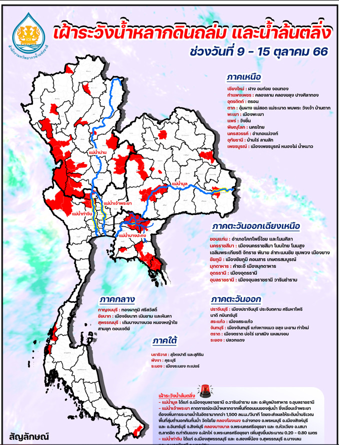 ทั้งนี้ สทนช. ได้วิเคราะห์คาดการณ์จะมีปริมาณน้ำเพิ่มขึ้น ซึ่งส่งผลให้ล้นตลิ่งบริเวณพื้นที่ลุ่มต่ำริมลำน้ำ โดยมี พื้นที่เสี่ยงต้องเฝ้าระวังเฝ้าระวังน้ำหลากดินถล่มรวม 26 จังหวัดในช่วงวันที่ 9 – 15 ตุลาคม 2566 ดังนี้