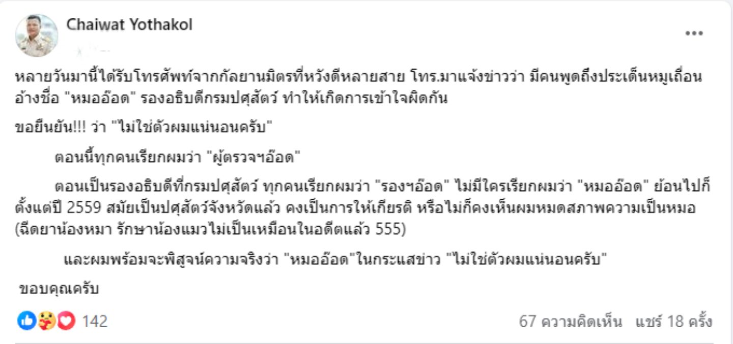 นายสัตวแพทย์ชัยวัฒน์ โยธคล ผู้ตรวจราชการกระทรวงเกษตรและสหกรณ์ซึ่งก่อนหน้าที่ดำรงตำแหน่งรองอธิบดีกรมปศุสัตว์ได้โพสต์เฟซบุ๊กว่า “หลายวันมานี้ได้รับโทรศัพท์จากกัลยาณมิตรที่หวังดีหลายสาย โทร. มาแจ้งข่าวว่า มีคนพูดถึงประเด็นหมูเถื่อน อ้างชื่อ “หมออ๊อด” รองอธิบดีกรมปศุสัตว์ ทำให้เกิดการเข้าใจผิดกัน ขอยืนยัน!!! ว่า “ไม่ใช่ตัวผมแน่นอนครับ” ตอนนี้ทุกคนเรียกผมว่า ‘ผู้ตรวจฯ อ๊อด’ ตอนเป็นรองอธิบดีที่กรมปศุสัตว์ ทุกคนเรียกผมว่า ‘รองฯ อ๊อด’ ไม่มีใครเรียกผมว่า ‘หมออ๊อด’ ย้อนไปก็ตั้งแต่ปี 2559 สมัยเป็นปศุสัตว์จังหวัดแล้ว คงเป็นการให้เกียรติ หรือไม่ก็คงเห็นผมหมดสภาพความเป็นหมอ (ฉีดยาน้องหมา รักษาน้องแมวไม่เป็นเหมือนในอดีตแล้ว 555) และผมพร้อมจะพิสูจน์ความจริงว่า ‘หมออ๊อด’ ในกระแสข่าว ‘ไม่ใช่ตัวผมแน่นอนครับ’ ขอบคุณครับ”