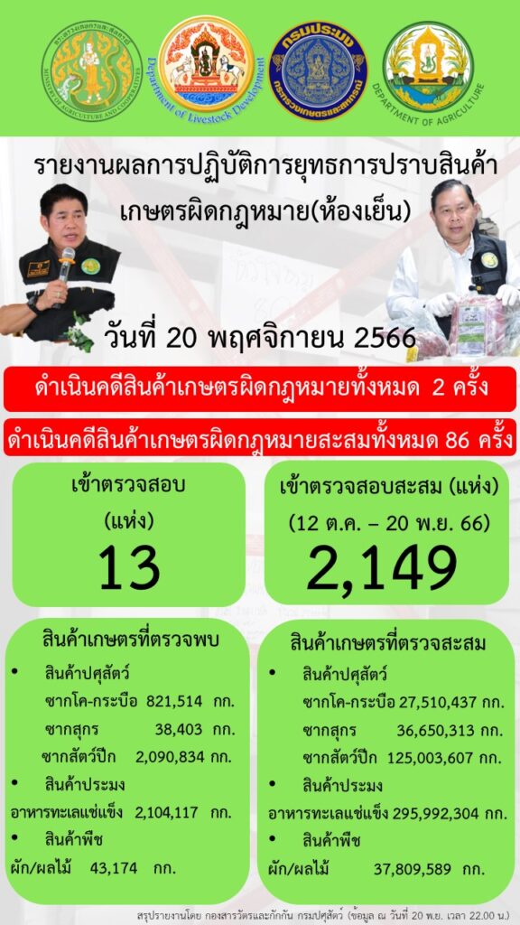 ทั้งนี้การดำเนินการทางกฎหมายต่อผู้กระทำผิด จะดำเนินการทั้งพ.ร.บ. โรคระบาดพืช ปศุสัตว์ และสัตว์น้ำของหน่วยงานสังกัดกระทรวงเกษตรและสหกรณ์ พ.ร.บ. ศุลกากร และพ.ร.บ. ป้องกันและปราบปรามการฟอกเงิน โดยยึดทรัพย์ที่มาจากการกระทำผิดด้วย