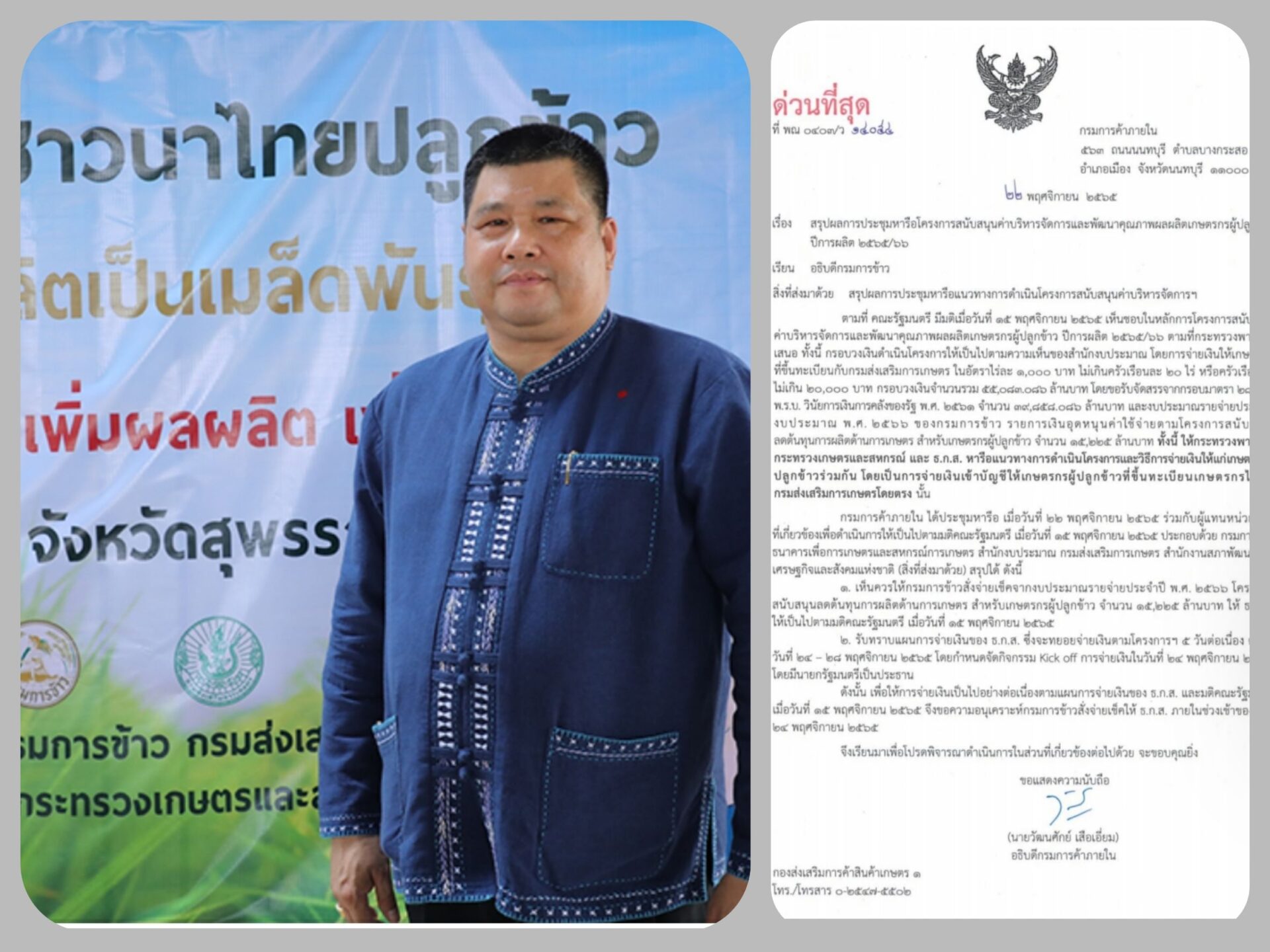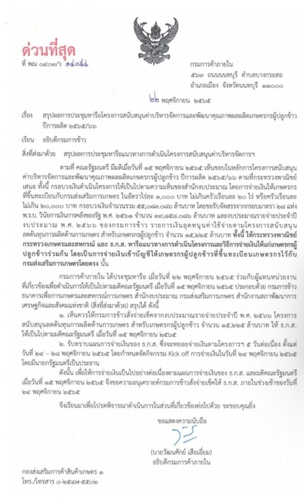 หนังสือด่วนที่สุด จากกรมการค้าภายใน กระทรวงพาณิชย์ เมื่อวันที่ 22 พฤศจิกายน 2565 ลงนามโดยนายวัฒนศักย์ เสือเอี่ยม อธิบดีกรมการค้าภายใน ทำถึงนายณัฏฐกิตติ์ ของทิพย์ อธิบดีกรมการข้าว เรื่อง สรุปผลการประชุมหารือโครงการสนับสนุนค่าบริหารจัดการและพัฒนาคุณภาพผลผลิตเกษตรกรผู้ปลูกข้าว ปีการผลิต 2565/66 ใจความสำคัญของหนังสือคือ ให้กรมการข้าวสั่งจ่ายเช็คจากงบประมาณรายจ่ายประจำปี พ.ศ. 2566 โครงการสนับสนุนลดต้นทุนการผลิตด้านการเกษตร สำหรับเกษตรกรผู้ปลูกข้าว 15,255 ล้านบาท ให้ ธ.ก.ส. ตามมติคณะรัฐมนตรี เมื่อวันที่ 15 พฤศจิกายน 2565 ที่เห็นชอบในหลักการโครงการสนับสนุนค่าบริหารจัดการและพัฒนาคุณภาพผลผลิตเกษตรกรผู้ปลูกข้าว ปีการผลิต 2565/66 ตามที่กระทรวงพาณิชย์เสนอ โดยธ.ก.ส. มีแผนจ่ายเงินเข้าบัญชีเกษตรกรในวันที่ 24 พฤศจิกายน 2565