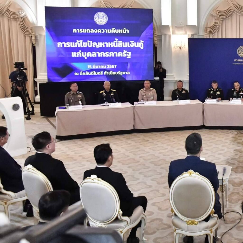 นายเศรษฐา ทวีสิน นายกรัฐมนตรีและรัฐมนตรีว่าการกระทรวงการคลังเป็นประธานการแถลงข่าวความคืบหน้าเกี่ยวกับการแก้ไขปัญหาหนี้เงินกู้ แก่บุคลากรภาครัฐ ณ ตึกสันติไมตรี ทำเนียบรัฐบาล โดยมีนายอนุทิน ชาญวีรกูล รองนายกรัฐมนตรีและรัฐมนตรีว่าการกระทรวงมหาดไทย นายสุทิน คลังแสง รัฐมนตรีว่าการกระทรวงกลาโหม นายชาดา ไทยเศรษฐ์ รัฐมนตรช่วยว่าการกระทรวงมหาดไทย นายจุลพันธ์ อมรวิวัฒน์ รัฐมนตรีช่วยว่าการกระทรวงการคลัง และนายกิตติรัตน์ ณ ระนอง ประธานที่ปรึกษานายกรัฐมนตรีเข้าร่วมรับฟังการรายงานความคืบหน้าในการดำเนินงานของหน่วยงานงานต่างๆ รวม 11 หน่วยงานได้แก่ กระทรวงกลาโหม กองบัญชาการกองทัพไทย กองทัพบก กองทัพเรือ กองทัพอากาศ สำนักงานตำรวจแห่งชาติ สำนักงานการศึกษาขั้นพื้นฐาน กระทรวงสาธารณสุข กรมส่งเสริมสหกรณ์ ธนาคารออมสินในฐานะสมาคมสถาบันการเงินของรัฐ และธนาคารกรุงไทย จำกัด (มหาชน) ในฐานะสมาคมธนาคารไทยรายงานแนวทางและผลการดำเนินงานแก้ปัญหาหนี้สินของบุคลากรภาครัฐตามนโยบายของนายกรัฐมนตรีที่ให้ไว้ตั้งแต่วันที่ 12 ธันวาคม 2566 เพื่อขอให้ทุกภาคส่วนร่วมกันแก้หนี้ทั้งระบบ