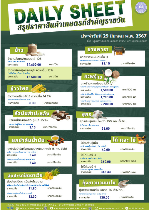 - ยางพารา ราคายางแผ่นดิบ ชั้น 3 ในปลายเดือนมีนาคมเฉลี่ยอยู่ที่ 83.15 บาท/กก. สูงขึ้นจากราคา ณ เดือน กันยายน 2566 ที่ราคาเฉลี่ย 45.51 บาท/กก. โดยราคาเริ่มปรับตัวสูงขึ้นอย่างต่อเนื่องจากนโยบายจากภาครัฐในการปราบปรามและตรวจสอบการลักลอบการนำเข้ายางพาราและสินค้าเกษตรผิดกฎหมายไม่ให้ทะลักเข้ามาจากประเทศเพื่อนบ้าน นอกจากนี้ ยังเป็นผลจากมาตรการการสนับสนุนการใช้ยางพาราในประเทศ รวมทั้งจากความต้องการของตลาด ภาวะฟื้นตัวของอุตสาหกรรมทั้งในและต่างประเทศ โดยเฉพาะกลุ่มยานยนต์ เป็นต้น