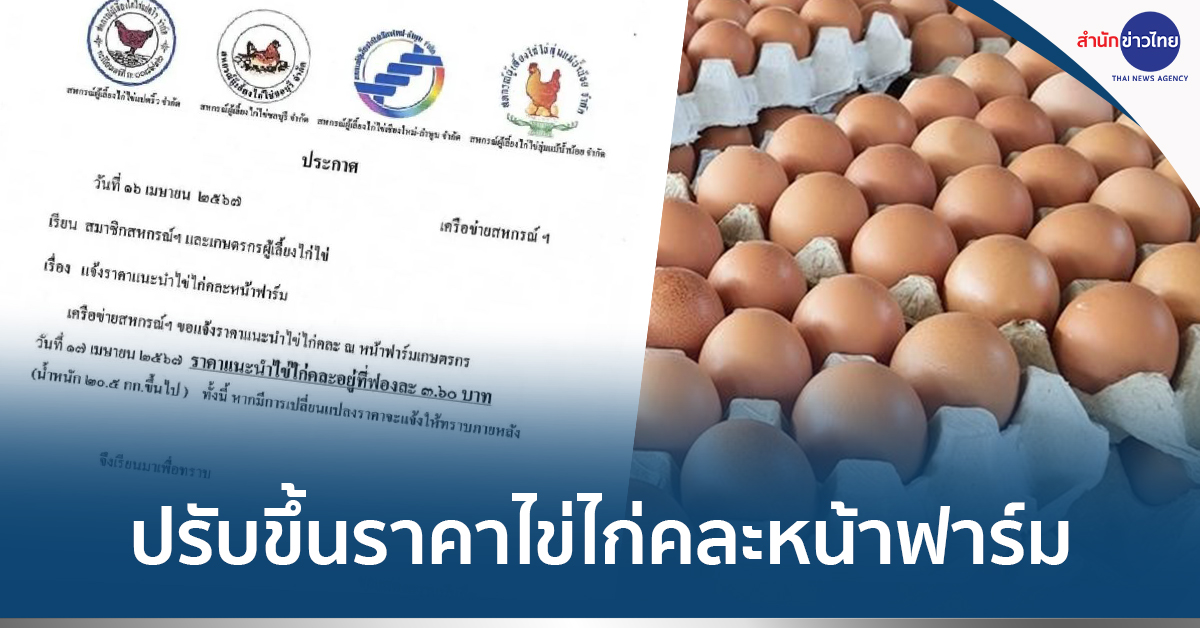เครือข่ายสหกรณ์ผู้เลี้ยงไก่ไข่ ประกอบด้วย สหกรณ์ผู้เลี้ยงไก่ไข่แปดริ้ว จำกัด สหกรณ์ผู้เลี้ยงไก่ไข่ชลบุรี จำกัด สหกรณ์ผู้เลี้ยงไก่ไข่เชียงใหม่-ลำพูน จำกัด และสหกรณ์ผู้เลี้ยงไก่ไข่ลุ่มแม่น้ำน้อย จำกัด ออกประกาศแจ้งสมาชิกสหกรณ์และเกษตรกรผู้เลี้ยงไก่ไข่ ปรับราคาไข่ไก่คละ ณ หน้าฟาร์มเกษตรกรขึ้นอีกฟองละ 20 สตางค์ หรือแผงละ 6 บาท ตั้งแต่วันที่ 17 เมษายน 2567 เป็นต้นไป ส่งให้ราคาไข่ไก่คละหน้าฟาร์มปรับจากฟองละ 3.40 บาท เป็น 3.60 บาท หรือแผงละ 108.00 บาท