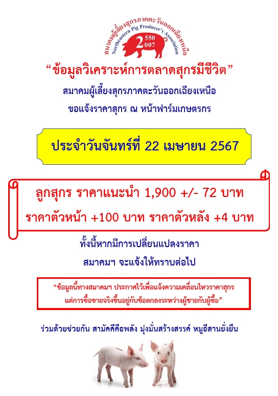 สหกรณ์ผู้เลี้ยงสุกรชลบุรี สมาคมผู้เลี้ยงสุกรภาคตะวันออกเฉียงเหนือ และสมาคมผู้เลี้ยงสุกรภาคใต้ประกาศปรับราคาแนะนำสุกรมีชีวิตหน้าฟาร์มขึ้นอีก 4 บาทจากราคาเดิมในสัปดาห์ก่อนหน้าซึ่งอยู่ที่ 68 – 75 บาท/กิโลกรัมขึ้นอยู่กับแต่ละพื้นที่ ทำให้ราคาขยับเข้าใกล้ต้นทุนการผลิตตามการประเมินของสำนักงานเศรษฐกิจการเกษตรที่ 78-80 บาท/กิโลกรัมมากขึ้น