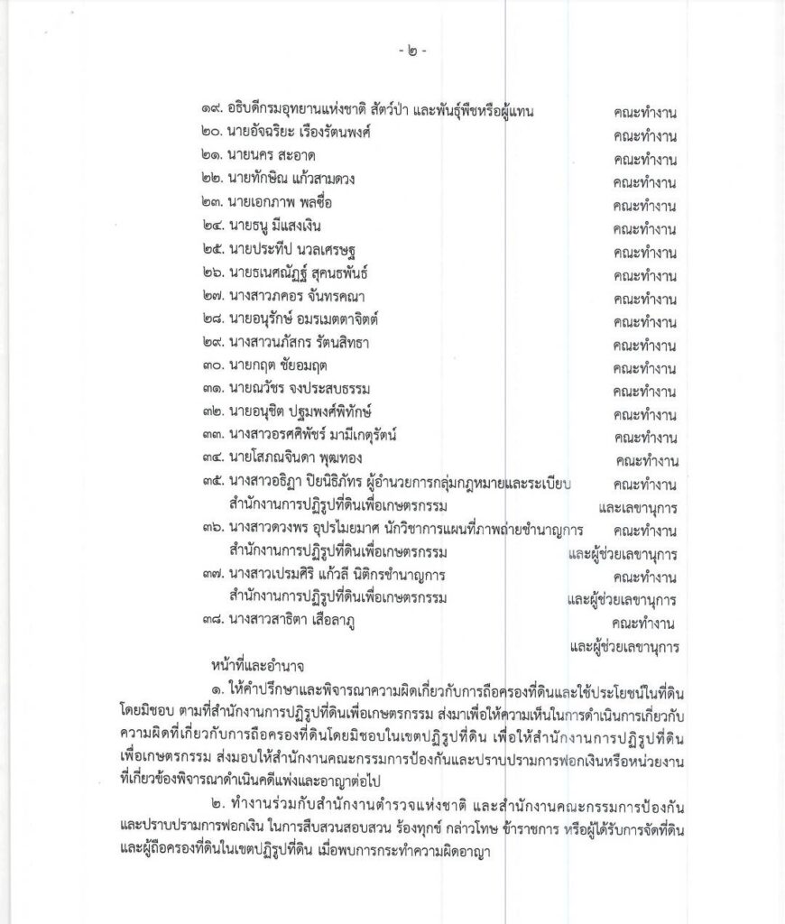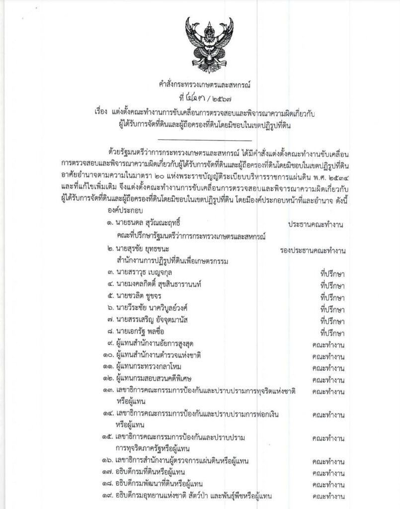 นายธนดล สุวัณณะฤทธิ์ ที่ปรึกษารัฐมนตรีว่าการกระทรวงเกษตรและสหกรณ์กล่าวว่า ได้เป็นประธานการประชุมคณะทำงานขับเคลื่อนการตรวจสอบและพิจารณาความผิดเกี่ยวกับผู้ได้รับการจัดที่ดินและผู้ถือครองที่ดินมิชอบในเขตปฏิรูปที่ดินนัดแรก โดยเป็นคณะทำงานที่ร้อยเอกธรรมนัส พรหมเผ่า รัฐมนตรีว่าการกระทรวงเกษตรและสหกรณ์ได้ลงนามคำสั่งแต่งตั้งขึ้น ให้มีหน้าที่และอำนาจให้คำปรึกษาและพิจารณาความผิดเกี่ยวกับการถือครองที่ดินและใช้ประโยชน์ในที่ดินโดยมิชอบ ตามที่สำนักงานการปฏิรูปที่ดินเพื่อเกษตรกรรม (ส.ป.ก.) ส่งมาเพื่อให้ความเห็นในการดำเนินการเกี่ยวกับความผิดที่เกี่ยวกับการถือครองที่ดินโดยมิชอบในเขตปฏิรูปที่ดิน เพื่อให้สำนักงานการปฏิรูปที่ดินเพื่อเกษตรกรรม ส่งมอบให้สำนักงานคณะกรรมการป้องกันและปราบปรามการฟอกเงินหรือหน่วยงานที่เกี่ยวข้องพิจารณาดำเนินคดีแพ่งและอาญาต่อไป ตลอดจนทำงานร่วมกับสำนักงานตำรวจแห่งชาติ และสำนักงานคณะกรรมการป้องกันและปราบปรามการฟอกเงิน ในการสืบสวนสอบสวน ร้องทุกข์ กล่าวโทษ ข้าราชการ หรือผู้ได้รับการจัดที่ดินและผู้ถือครองที่ดินในเขตปฏิรูปที่ดิน เมื่อพบการกระทำความผิดอาญา