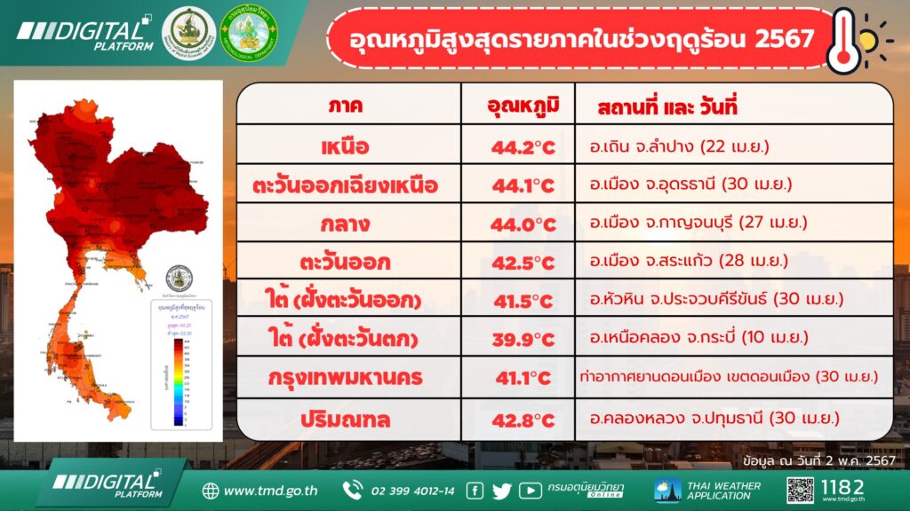 สำหรับอุณหภูมิเฉลี่ยฤดูร้อนปีนี้ สูงกว่าค่าปกติประมาณ 0.7 – 1.1 องศาเซลเซียสตามแต่ละภูมิภาค