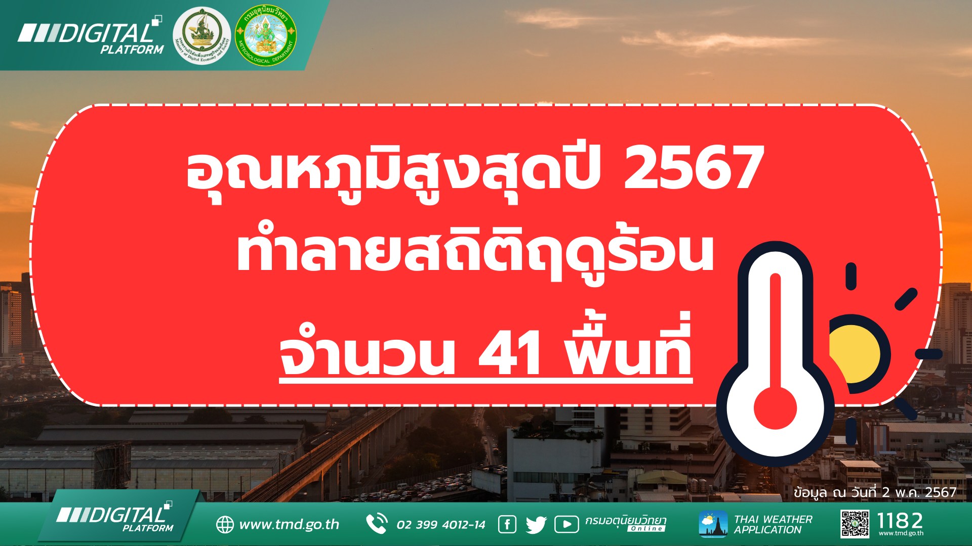 กรมอุตุนิยมวิทยาคาดว่า ประเทศจะเข้าสู่ฤดูฝนในสัปดาห์ที่ 4 ของเดือนพฤษภาคม ดังนั้นช่วงที่ร้อนที่สุดผ่านไปแล้ว อุณหภูมิจะไม่สูงไปกว่านี้ โดยอุณหภูมิสูงสุดของฤดูร้อน 2567 อยู่ที่ 44.2 องศาเซลเซียสที่อำเภอเถิน จังหวัดลำปางเมื่อวันที่ 22 เมษายนซึ่งยังไม่ทำลายสถิติที่เคยบันทึกได้ 44.6 องศาเซลเซียสที่จังหวัดแม่ฮ่องสอนในปี 2559 และที่จังหวัดตากในปี 2566 โดยมีพื้นที่ที่อุณหภูมิสูงสุดทำลายสถิติเดิมในฤดูร้อน 41 พื้นที่