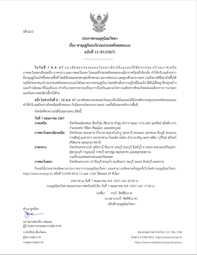 ลักษณะของอากาศจะมีพายุฝนฟ้าคะนอง ลมกระโชกแรง และลูกเห็บตกบางแห่ง รวมถึงอาจมีฟ้าผ่าเกิดขึ้นได้ ขอให้ประชาชนระวังอันตรายจากพายุฤดูร้อน โดยหลีกเลี่ยงการอยู่ในที่โล่งแจ้ง ใต้ต้นไม้ใหญ่ สิ่งปลูกสร้าง และป้ายโฆษณาที่ไม่แข็งแรง สำหรับเกษตรกรควรเตรียมการป้องกันและระวังความเสียหายที่จะเกิดต่อผลผลิตทางการเกษตรและอันตรายต่อสัตว์เลี้ยงไว้ด้วย