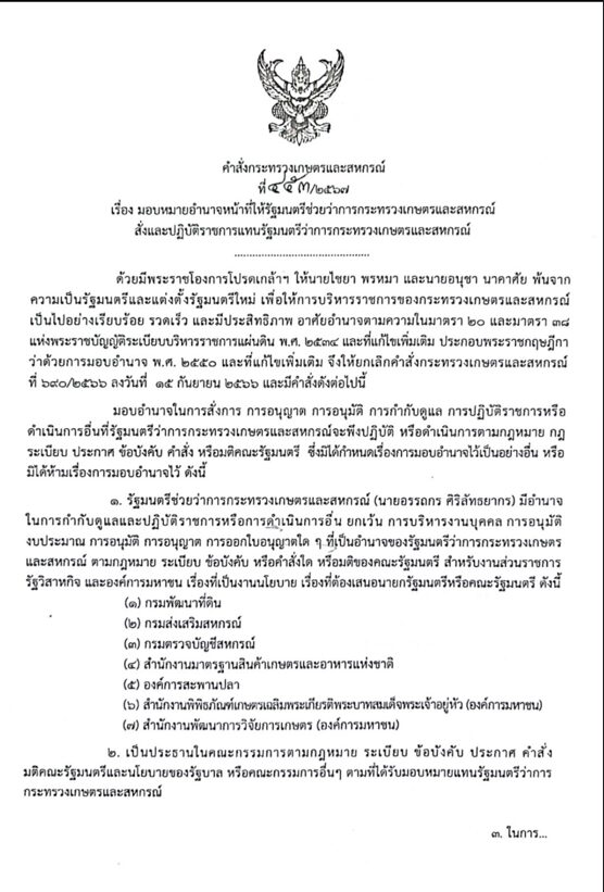 ในคำสั่งมอบหมายอำนาจหน้าที่ยังระบุว่า “รัฐมนตรีช่วยว่าการกระทรวงเกษตรและสหกรณ์มีอำนาจในการกำกับดูแลและปฏิบัติราชการหรือการดำเนินการอื่น ยกเว้น การบริหารงานบุคคล การอนุมัติงบประมาณ การอนุมัติ การอนุญาต การออกใบอนุญาตใดๆ ที่เป็นอำนาจของรัฐมนตรีว่าการกระทรวงเกษตรและสหกรณ์ ตามกฎหมาย ระเบียบ ข้อบังคับ หรือคำสั่งใด หรือมติของคณะรัฐมนตรี สำหรับงานส่วนราชการรัฐวิสาหกิจ และองค์การมหาชน เรื่องที่เป็นงานนโยบาย เรื่องที่ต้องเสนอนายกรัฐมนตรีหรือคณะรัฐมนตรีของ 7 หน่วยงานดังกล่าว