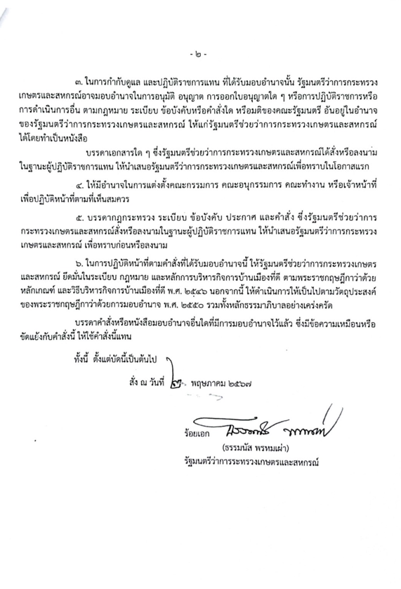 นอกจากนี้ในการกำกับดูแลและปฏิบัติราชการแทนที่ได้รับมอบอำนาจนั้น รัฐมนตรีว่าการกระทรวงเกษตรและสหกรณ์อาจมอบอำนาจในการอนุมัติ อนุญาต การออกใบอนุญาตใดๆ หรือการปฏิบัติราชการหรือการดำเนินการอื่น ตามกฎหมาย ระเบียบ ข้อบังคับหรือคำสั่งใด หรือมติของคณะรัฐมนตรี อันอยู่ในอำนาจของรัฐมนตรีว่าการกระทรวงเกษตรและสหกรณ์ ให้แก่รัฐมนตรีช่วยว่าการกระทรวงเกษตรและสหกรณ์ได้โดยทำเป็นหนังสือ บรรดาเอกสารใด ๆ ซึ่งรัฐมนตรีช่วยว่าการกระทรวงเกษตรและสหกรณ์ได้สั่งหรือลงนามในฐานะผู้ปฏิบัติราชการแทน ให้นำเสนอรัฐมนตรีว่าการกระทรวงเกษตรและสหกรณ์เพื่อทราบในโอกาสแรก”