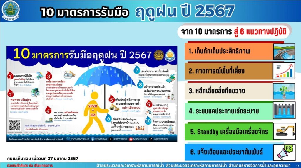 พร้อมกันนี้ได้วางมาตรการบริหารจัดการน้ำฤดูฝน เพื่อให้มีปริมาณน้ำเพียงพอใช้ไปจนถึงฤดูแล้งหน้า ด้วยการจัดสรรน้ำเพื่อการอุปโภคบริโภคและรักษาระบบนิเวศอย่างเพียงพอ พร้อมขอความร่วมมือเกษตรกรที่จะเพาะปลูกข้าวนาปีให้ใช้น้ำฝนเป็นหลัก โดยรอให้ฝนตกสม่ำเสมอก่อนจึงค่อยเตรียมแปลงเพาะปลูก แล้วใช้น้ำชลประทานเสริม