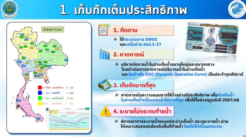 ทั้งนี้พื้นที่ในเขตชลประทานไม่ได้รับผลกระทบจากปัญหาการขาดแคลนน้ำ อีกทั้งยังมีปริมาณน้ำสำรองไว้ใช้ในช่วงต้นฤดูฝนอย่างเพียงพอ โดย ณ วันที่ 1 พ.ค. 67 อ่างเก็บน้ำขนาดใหญ่และขนาดกลางทั้งประเทศมีปริมาณน้ำรวมกันทั้งสิ้น 41,765 ล้าน ลบ.ม. ยังสามารถรองรับน้ำในช่วงฤดูฝนได้อีกกว่า 34,572 ล้าน ลบ.ม. เฉพาะลุ่มน้ำเจ้าพระยา 4 เขื่อนหลักประกอบด้วยเขื่อนภูมิพล เขื่อนสิริกิติ์ เขื่อนแควน้อยบำรุงแดน และเขื่อนป่าสักชลสิทธิ์มีปริมาณน้ำรวมกัน 11,256 ล้าน ลบ.ม. โดยสามารถรองรับน้ำในช่วงฤดูฝนได้อีกกว่า 13,615 ล้าน ลบ.ม.
