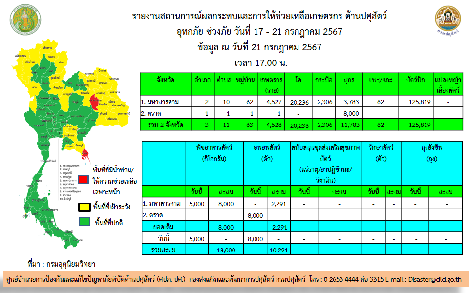 ศูนย์อำนวยการป้องกันและแก้ไขปัญหาภัยพิบัติด้านปศุสัตว์รายงานการให้ความช่วยเหลือผู้ประสบภัยพิบัติด้านปศุสัตว์ล่าสุดว่า มีจังหวัดได้รับผลกระทบ 2 จังหวัดได้แก่ มหาสารคาม และตราด จำนวน 3 อำเภอ 11 ตำบล 63 หมู่บ้าน เกษตรกร 4,528 ราย มีสัตว์ได้รับผลกระทบ 160,206 ตัว เป็นโค 20,236 ตัว กระบือ 2,306 ตัว สุกร 11,783 ตัว แพะ/แกะ 62 ตัว และสัตว์ปีก 125,819 ตัว