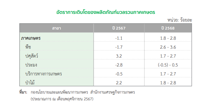 ศ.ดร.นฤมล กล่าวว่า แนวโน้มเศรษฐกิจการเกษตรของไทยปี 2568 คาดว่า จะขยายตัวอยู่ในช่วงร้อยละ 1.8 – 2.8 โดยมีปัจจัยสนับสนุนดังนี้