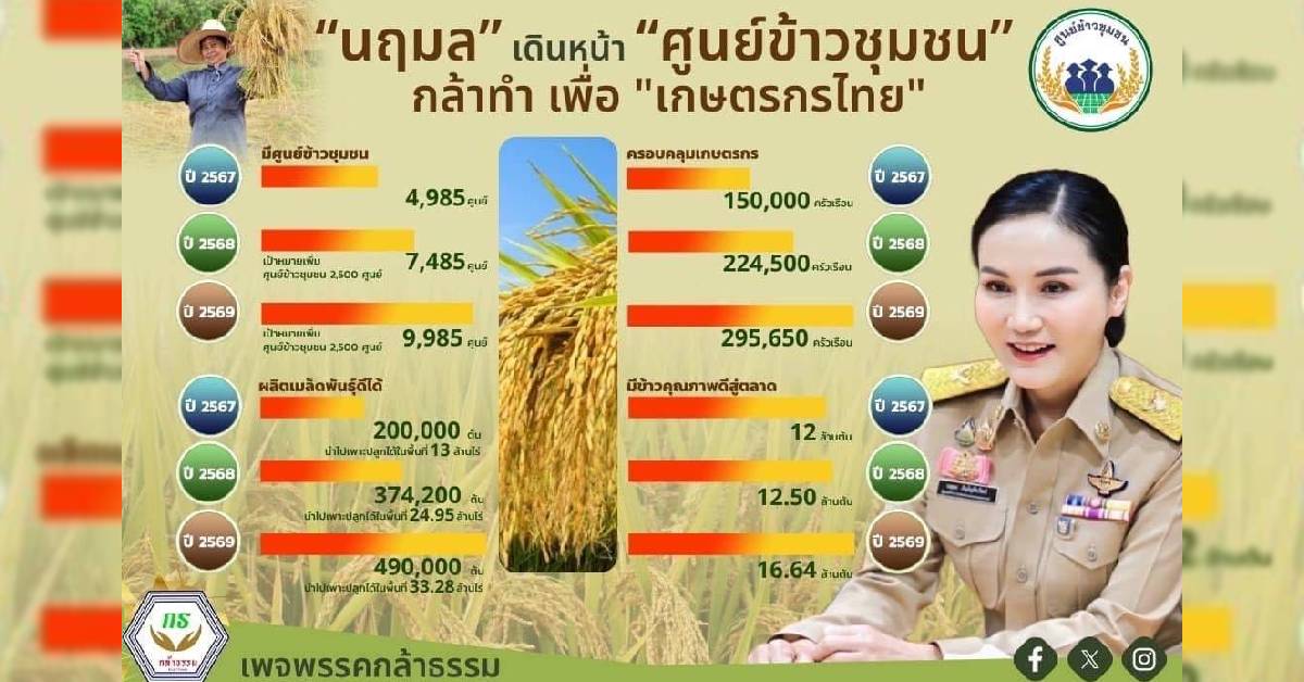 ศ.ดร.นฤมล ภิญโญสินวัฒน์ รัฐมนตรีว่าการกระทรวงเกษตรและสหกรณ์ และหัวหน้าพรรคกล้าธรรม กล่าวว่า กระทรวงเกษตรและสหกรณ์ โดย กรมการข้าวมีนโยบายส่งเสริมและสนับสนุนให้เกษตรกรผู้ปลูกข้าวรวมตัวกันจัดตั้ง “ศูนย์ข้าวชุมชน” เพื่อเป็นรากฐานในการส่งเสริมและพัฒนาการผลิตข้าว โดยมุ่งเน้นการผลิตและการกระจายเมล็ดพันธุ์ดี เปิดโอกาสให้เกษตรกรผู้ปลูกข้าวมีส่วนร่วมในการบริหารจัดการเกี่ยวกับการพัฒนาข้าวด้วยตนเอง ช่วยให้ชุมชนและองค์กรชาวนาเกิดความเข้มแข็ง โดยในปี 2567 สามารถจัดตั้งศูนย์ข้าวชุมชนได้ 4,985 ศูนย์ ครอบคลุมเกษตรกร 150,000 ครัวเรือน และผลิตเมล็ดพันธุ์ดีได้ 200,000 ตัน สามารถนำไปเพาะปลูกได้ในพื้นที่ 13 ล้านไร่ ทำให้มีข้าวคุณภาพดีสู่ตลาดจำนวน 12 ล้านตัน